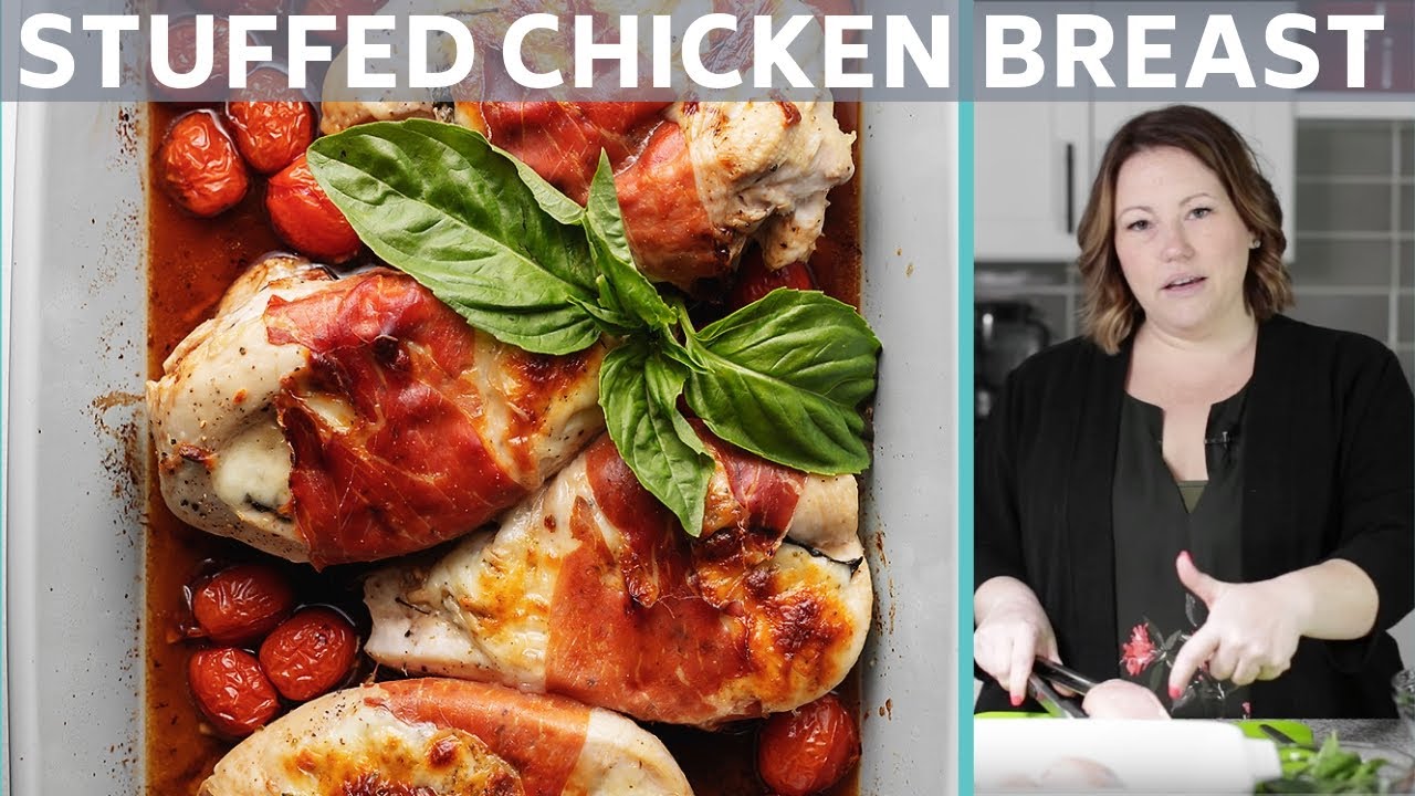 These mozzarella cheese stuffed chicken breast are filled with Italian flavors and wrapped with prosciutto. They are baked in the oven until perfect and I show you my trick for keeping the stuffing from melting out!