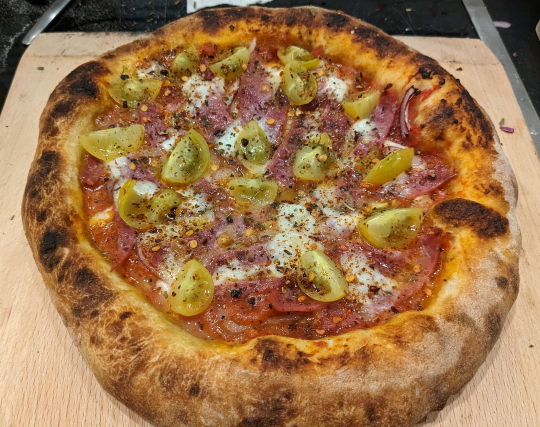 3. Pizza Diavolo with Salami Milanese, red onions, homemade chili sauce and yellow cherry tomatoes