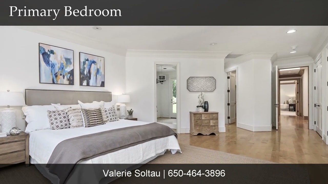 The kitchen has a grand center island with prep sink and warming drawer, a huge walk-in pantry, a built-in desk area and tons of storage. The temperature-controlled wine room is on one side of the kitchen while a charming family room is on the other side. The family room has space for casual dining, a fireplace and sliders to the backyard.