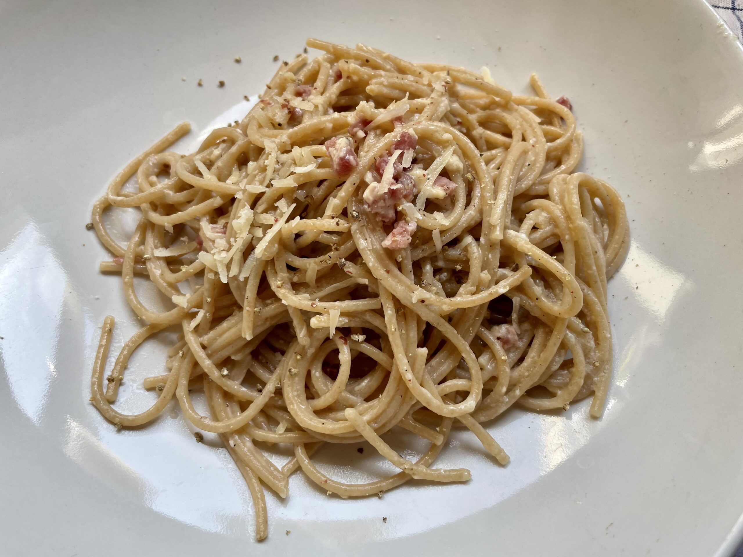 200g store-brand bacon cubes, 4 full eggs, 30g parmesan, mixed peppercorns, 500g full-grain spaghetti broken in half — slightly fry the bacon; cook spaghetti; in a bowl, mix eggs, parmesan and pepper. When the pasta is cooked, add it to the bacon pan with some pasta water, mix well, then add egg mix and stir, stir, stir!