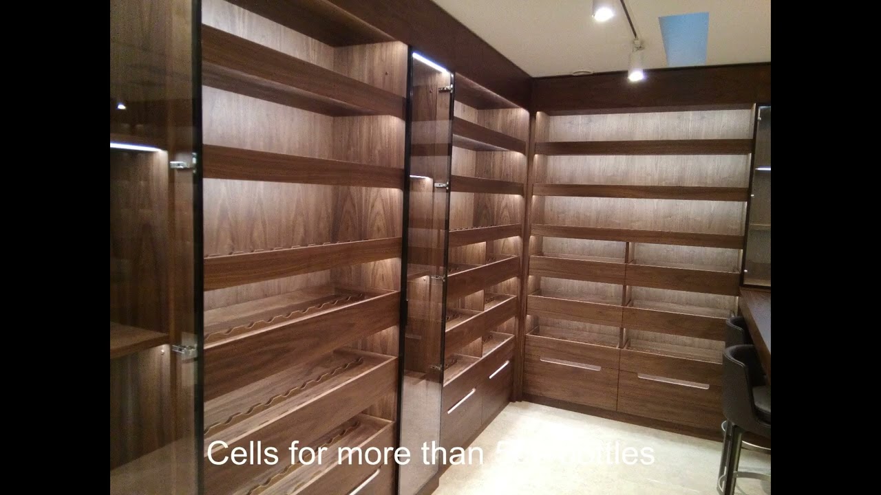 made of American walnut MDF panels, Italian fittings, tinted to match the elegant tone of muscat.Capacity for 550 bottles, with drawers, lighting and a degustation table.It was made by special order for the collector and connoisseurs of winemaking .Glass facades emphasize the intimate atmosphere of the sacrament of the divine beverage tasting.