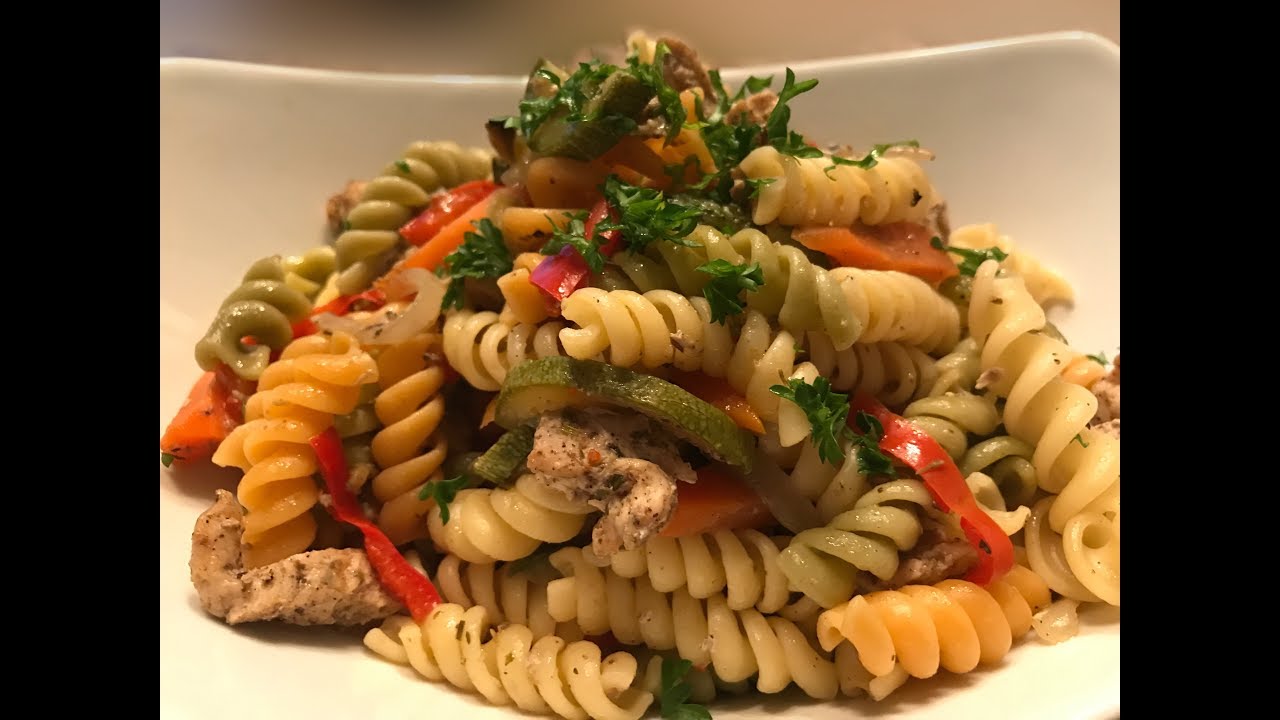 Preheat oven to 450 degrees. Chop all vegetables into long strips and into a cooking pan like the picture in the video. Then you add all the seasonings and live oil mix well. Cook for 25-30 minutes remove from oven and set aside. Boil water in a pot and add oil and salt, add the pasta and cook. once its finished drain the water from the pasta and add it into the chicken and veggie mixture. mix well and Enjoy with garlic bread.