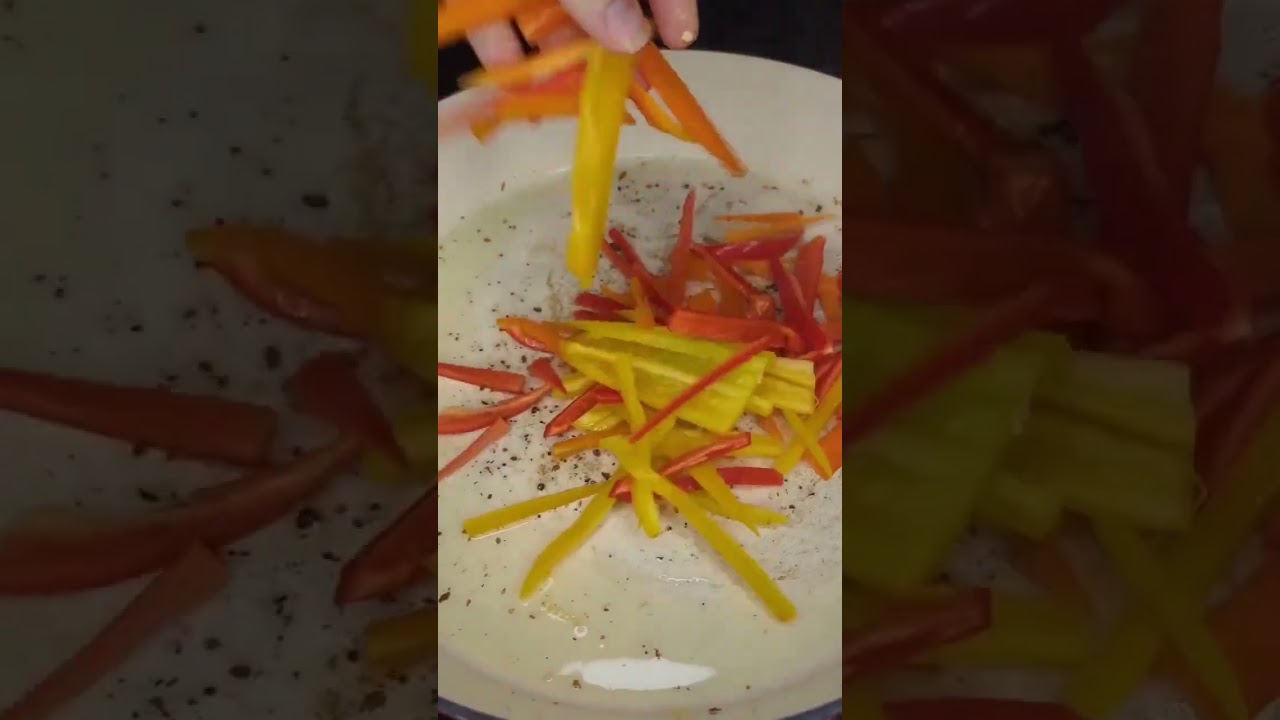 1.Slice peppers and onions into thin strips
