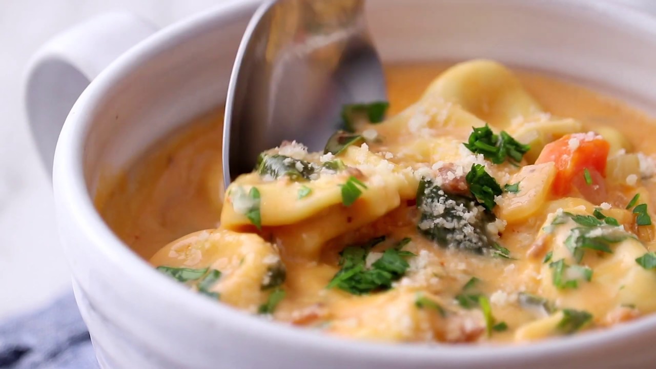 Creamy Tortellini Soup that is comforting, cozy, and so yummy! Rich and creamy tomato broth, cheesy tortellini, fresh spinach, and Italian sausage.