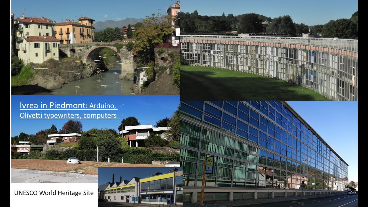 Ivrea , population about 25000, is a town in the Piedmont region of northwestern Italy, situated on the road leading to the Aosta Valley. UNESCO, when it designated the city a World Heritage Site, said that it “expresses a modern vision of the relationship between industrial production and architecture. The Open Air Museum of Modern Architecture, inaugurated in 2001, is a show of the main edifices (some by leading architects of the time) built by Olivetti from the 1950s onwards. The Arduino electronic platform was created at the Interaction Design Institute Ivrea, and takes its name from a bar named after the historical figure of Arduin of Italy.
