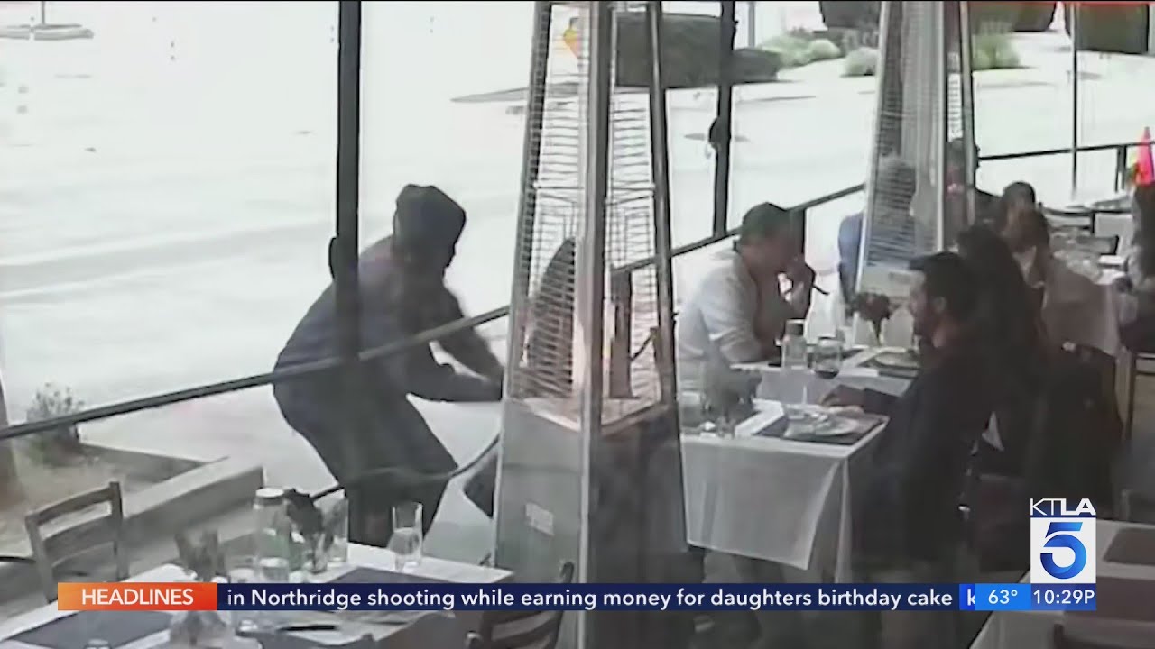 Video captured the moment a purse-snatching incident ended in gunfire at a Culver City restaurant. Police are searching for at least three suspects involved in the coordinated theft.