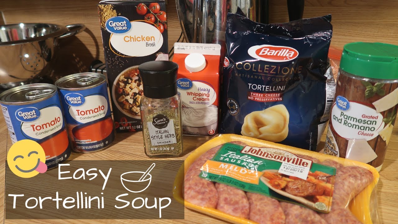 Brown the sausage (casting removed) in olive oil, add onion & garlic, cook until fragrant add tomato soup, broth, cream, and seasoning. Bring to a boil. Add tortellini and simmer until pasta is done. Sprinkle with romano cheese.