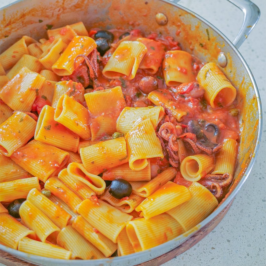 Pasta alla Luciana, originates in Naples, combining tender baby octopus with capers and black olives. The salty flavours of the ocean mixed with sweet tomatoes and the crunch of olives will take you on a trip to the Mediterranean.