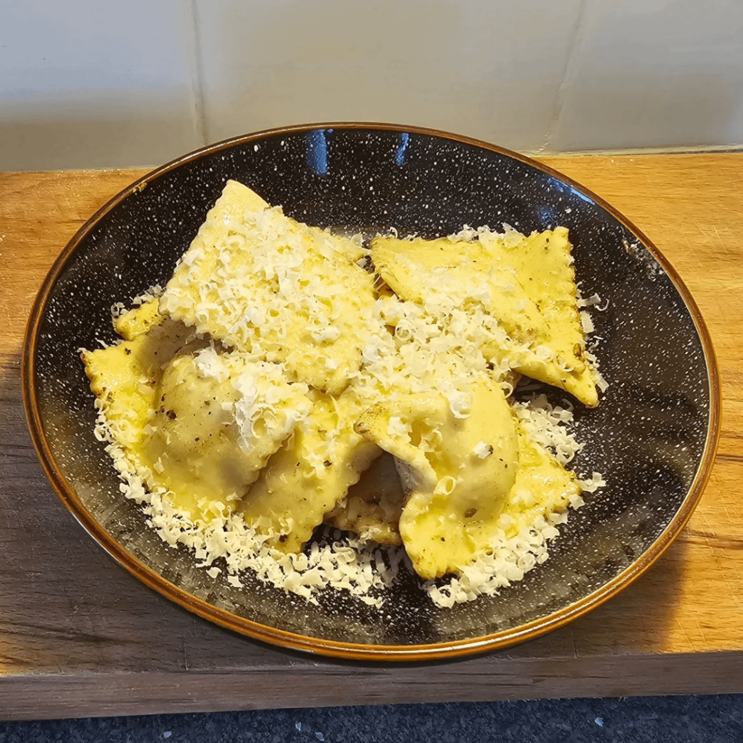 theghostofmarkesmith 3 years ago This is super easy to make. The ravioli filling is melted fontina cheese in milk with an egg yolk cooked until thick. Once cooled stuff your homemade pasta and seal/cut. Sauce is a very simple sage butter sauce!
