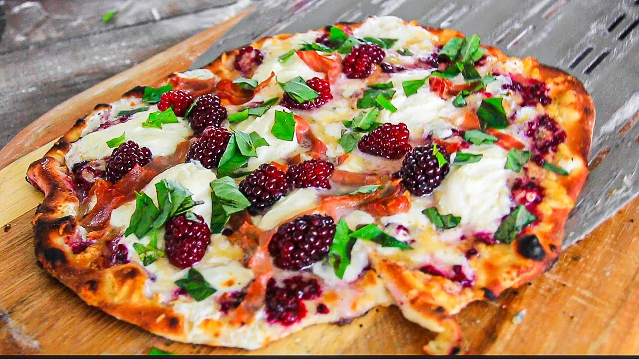 Set your Roccbox to high and let it come up to temperature while you are preparing dough and toppings. Roll out pizza dough into round shape making sure not to make it bigger than the Roccbox opening. Lay down a light coating of olive oil on to the dough then sprinkle with a little salt and pepper. Smash blackberries and spread them out onto the pizza dough. The. start adding the other toppings, mozzarella, parmesan, ricotta, and prosciutto. Flour your peel and place pizza on the peel. Insert into the Roccbox. Rotate frequently so the pizza doesn’t burn. Total cooking time is just a few minutes.