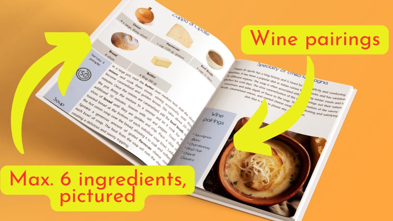 Discover the ultimate culinary experience with our visually stunning cookbook! Simplify your cooking adventures with a maximum of six ingredients per recipe, so you know immediately what you need. Save time, money, and unleash your creativity in the kitchen. With wine pairing suggestions, elevate your meals to new heights. Join us on this delectable journey through Italian cuisine and unlock your inner chef.
