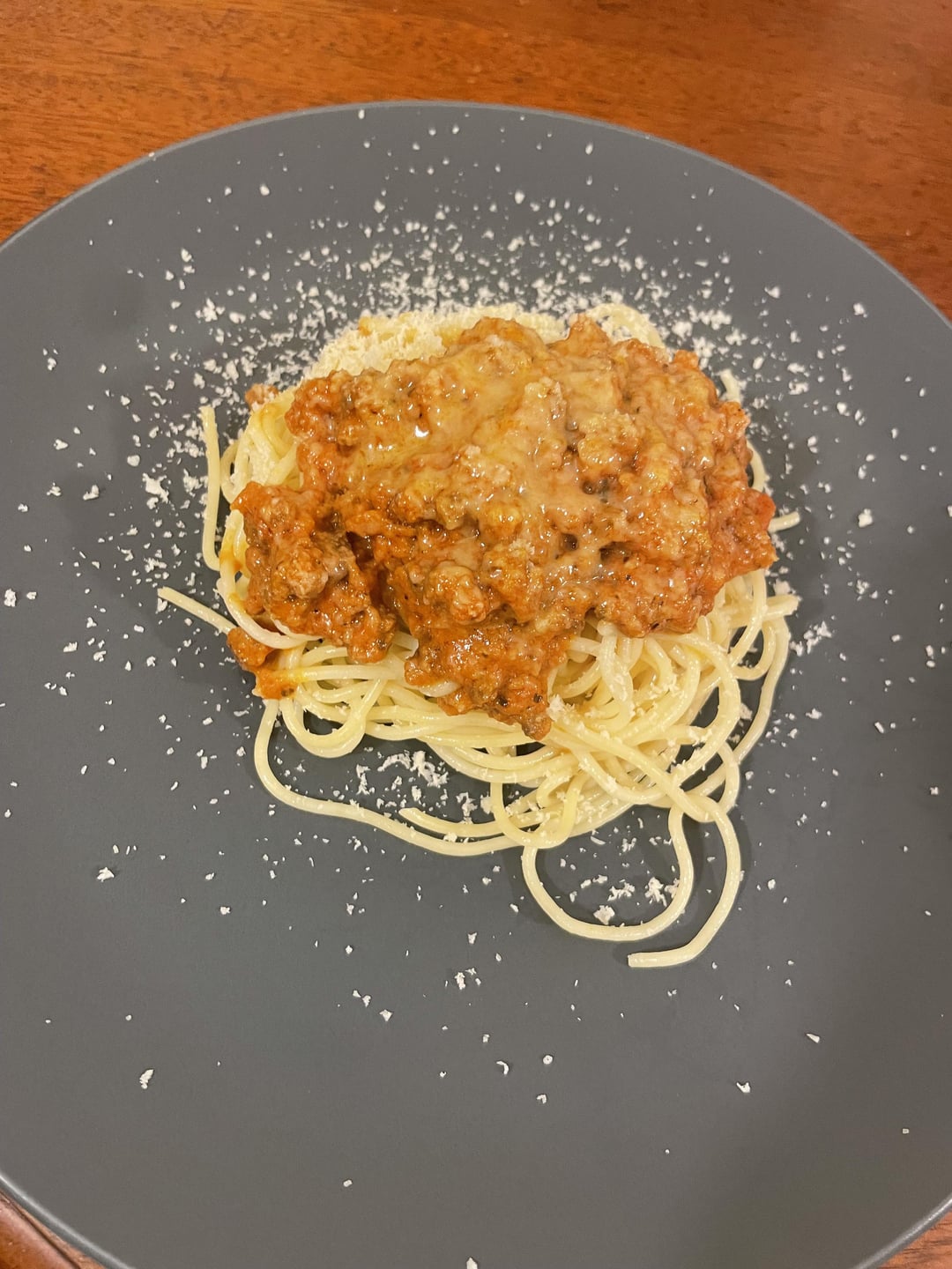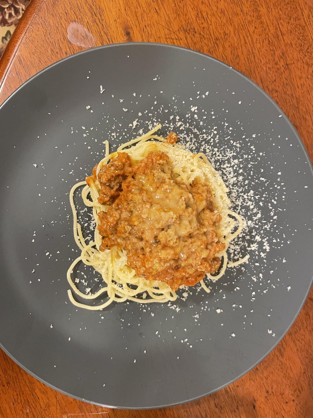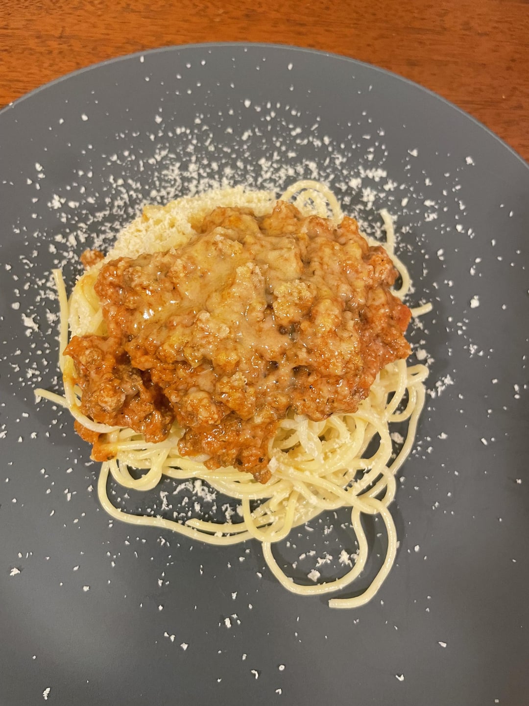 Not a bad attempt and I appreciate the commitment to plating. A few points – as others have suggested, learn to emulsify the pasta, sauce and starch from the pasta water together for even coating. The way you are serving it will be dry and some places which isn’t desirable – chose a good quality pasta and select the right kind of noodle for a dish like this. Bolognese is a heavy sauce and need a strong noodle to stand up to it. The plating of this kind of screams lunchtime cafeteria – also, the sauce looks a little weak for a traditional bolognese. As the flavor develops the color should turn a very deep red from the caramelization of the sauce over the course of 4-6 hours.