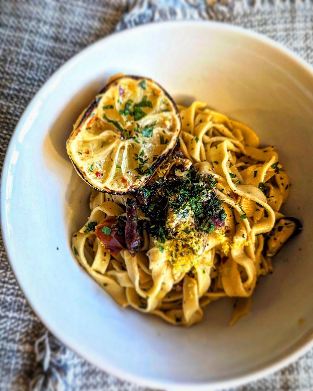 Cook – cook and render prosciutto fat on stove. Remove strips once fully cooked and fat rendered – in the same pan, cook garlic, black pepper and automatics until fragrant and garlic golden brown – add mussels to pot and pour in about 1/2 bottle of wine and cover until mussels open – once mussels are cooked and opened, remove from pot and separate meat from shell (optional) – lower heat and add in juice from charred lemon (removing seeds) and a tablespoon of miso (I used white) – while sauce is going, cook pasta for 2-3 min, reserving salted starchy pasta water