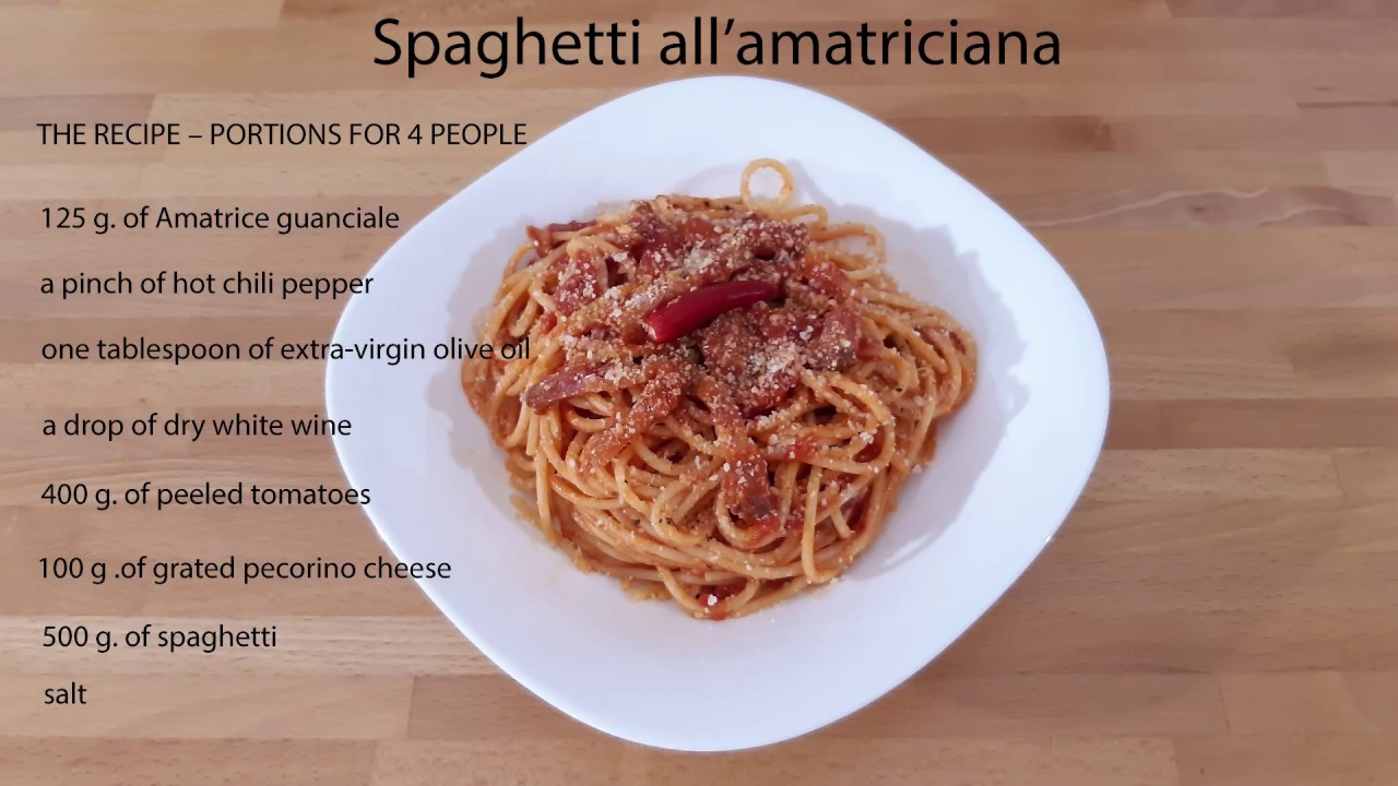 Spaghetti all’amatriciana, is a traditional Italian pasta based on guanciale (cured pork cheek), pecorino cheese, peeled tomato, white wine and red hot chili pepper.