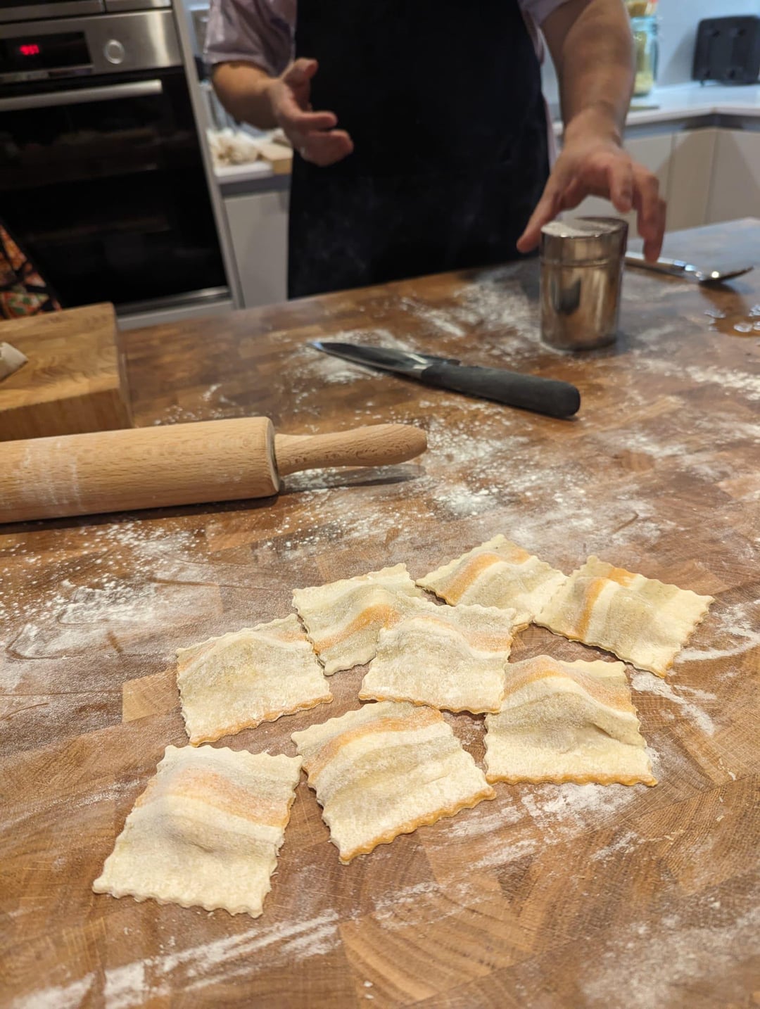 Make 3 basic fresh pastas, I did mine without egg. For two of them mix powdered herbs (I used peperoncino for red and the green is a timo blend) of choice. Adjust amount depending on how strong or week you prefer the taste. Roll the different coloured pastas into thin sausages, place in the order of preference and then roll together to combine.
