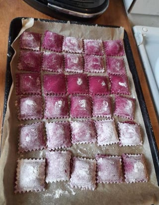 1 large beetroot roasted in a little olive oil then skinned and processed into puree to use instead of water in the flour mix approx 2 cups to 60-70ml puree.