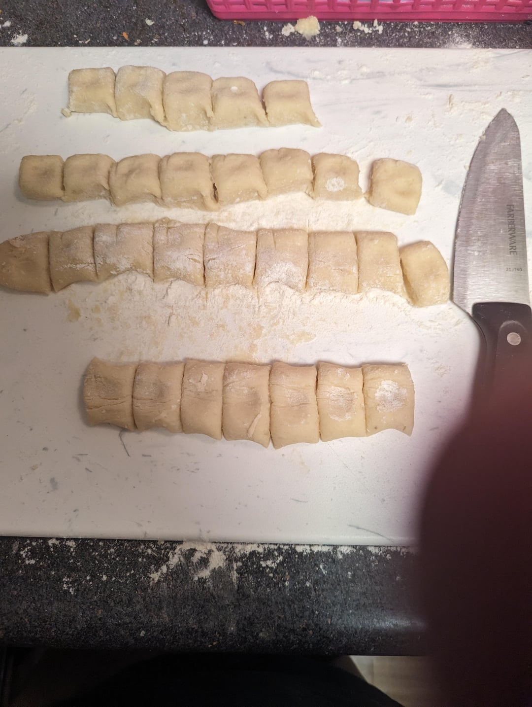 If I am really trying to impress I have a little wooden gnocchi board with the groves that I roll them down but as often as not I just cut them in to pillows and cook !