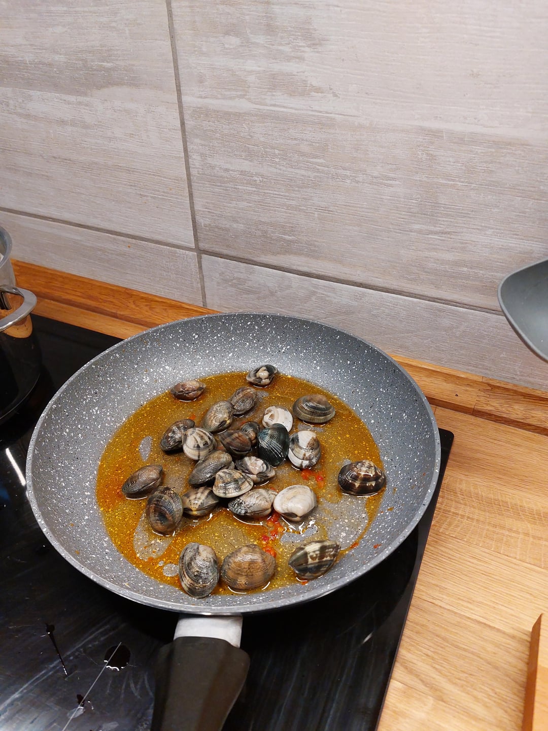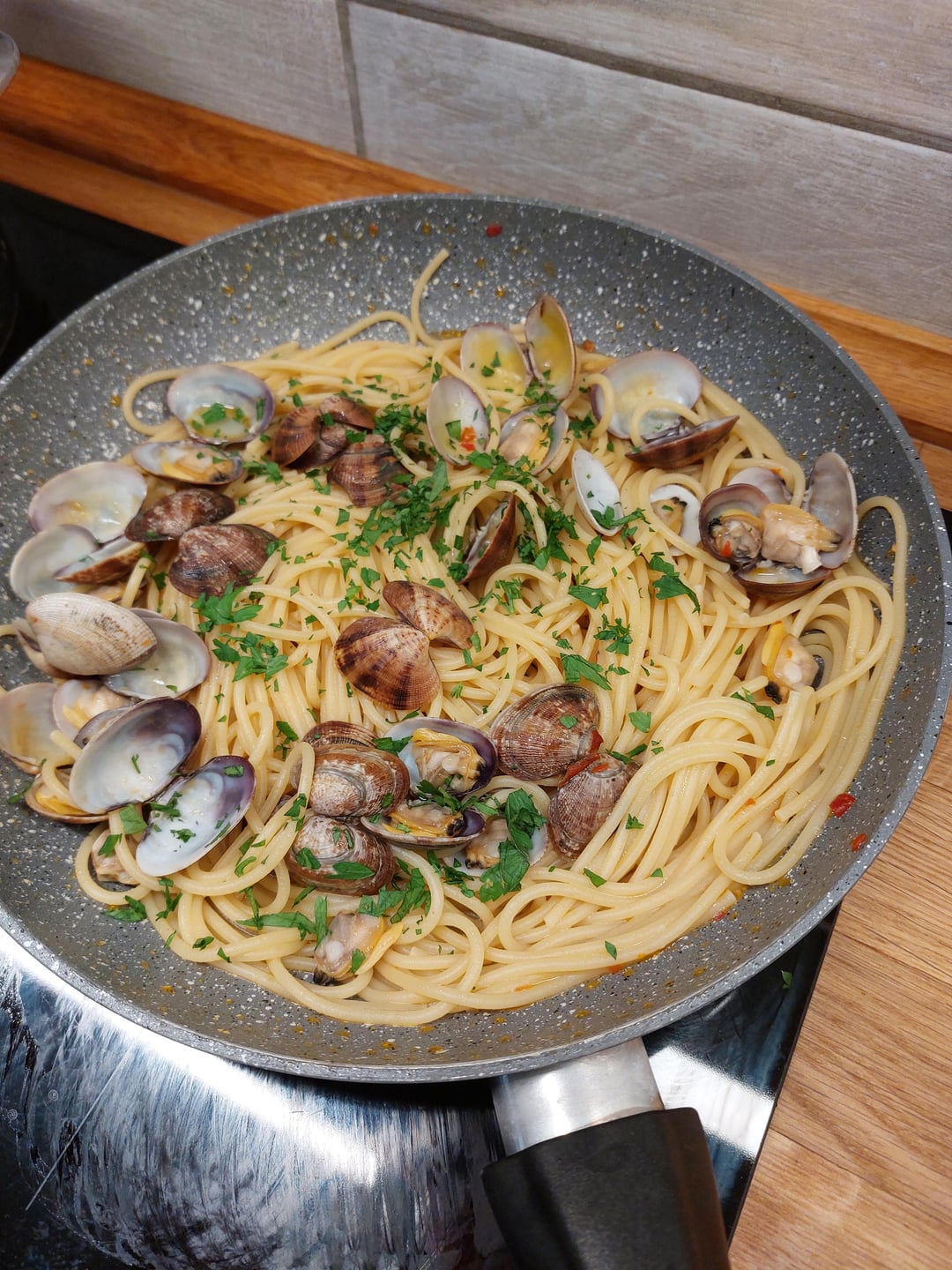 Recipe: 320g Spaghettoni, 700g Vongole Veraci, aglio, olio, peperoncino, prezzemolo q.b.