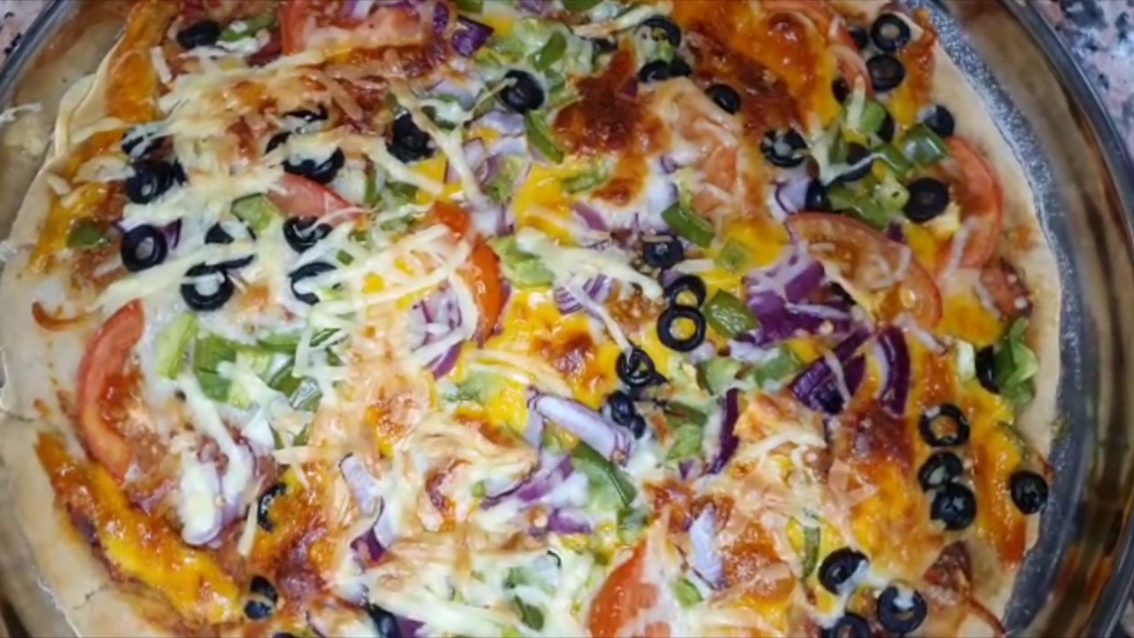 Today I’m sharing my take on Italian pizza. All you need is 2 large pans, 2 cups flour, 1/4 cup olive oil, pinch of salt, 1 tsp sugar, instant yeast.