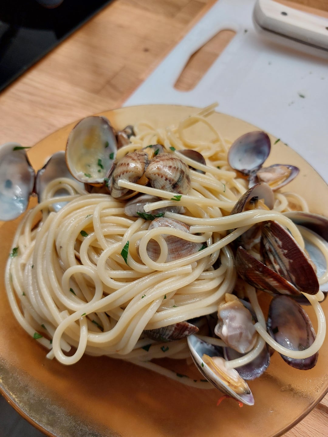 4 persons: 320g Spagettoni, 700g Vongole veraci, 1 peperoncino, 1 garlic, olio EVO, Vino Riflessi bianco fermo, parsley Q.b. by UltimaITA Homemade DishPasta 2 Comments Interesting_Ad_7741 2 years ago Always wanted to eat this vongole pasta 😂 FussyBritches31 2 years ago Found a fellow [clam guy](https://youtu.be/ZxIiN3DKqUs?si=tcwgvFLNGHXnjDXq)Write A CommentYou must be logged in to post a comment.