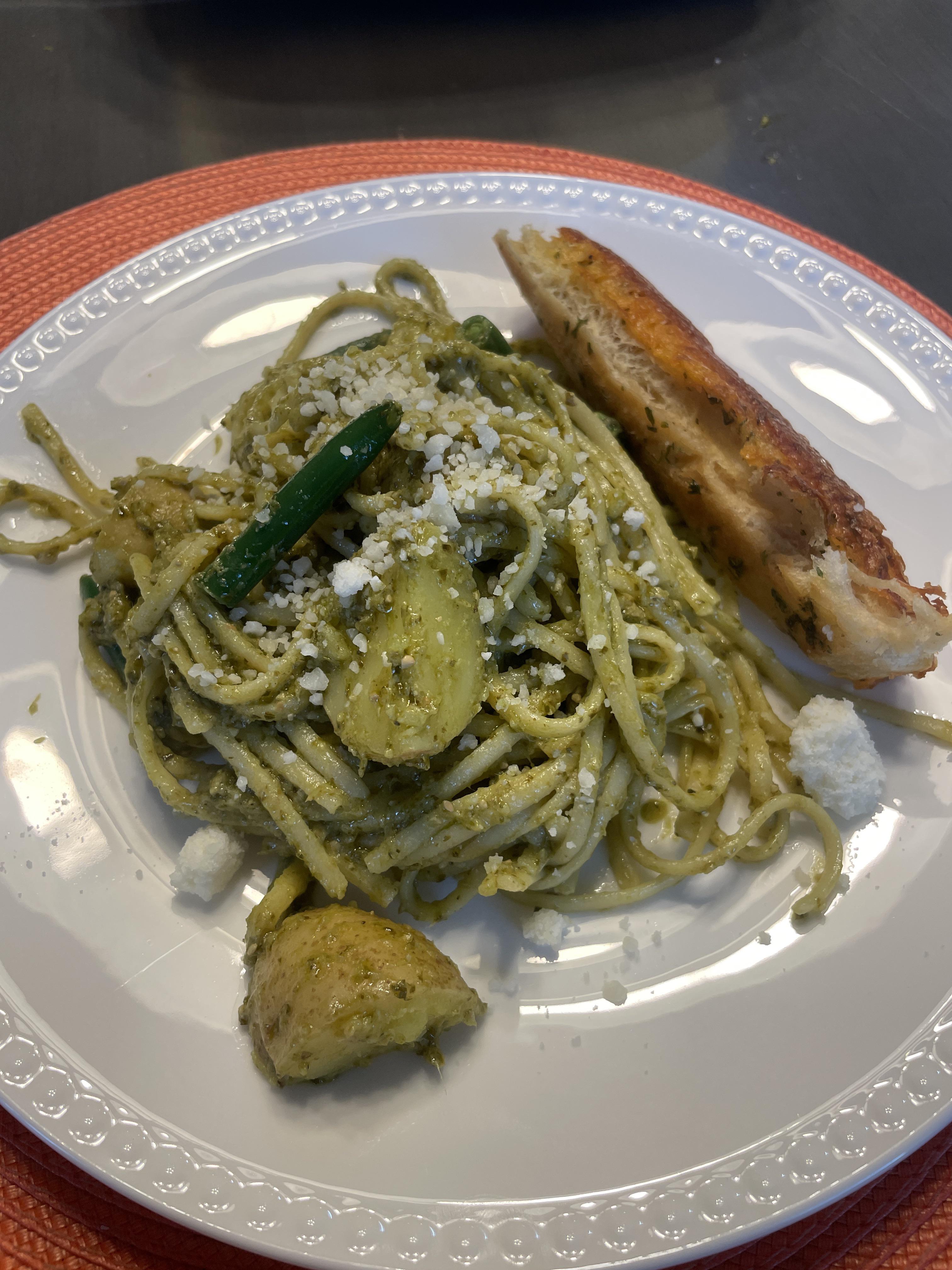 Toss with pesto sauce. To the same large pot, pour in the prepared pesto sauce. Place over medium heat, then add the drained pasta and veggies along with ½ cup of reserved pasta cooking water. Toss until heated through and the pasta is well coated, about 2 minutes.