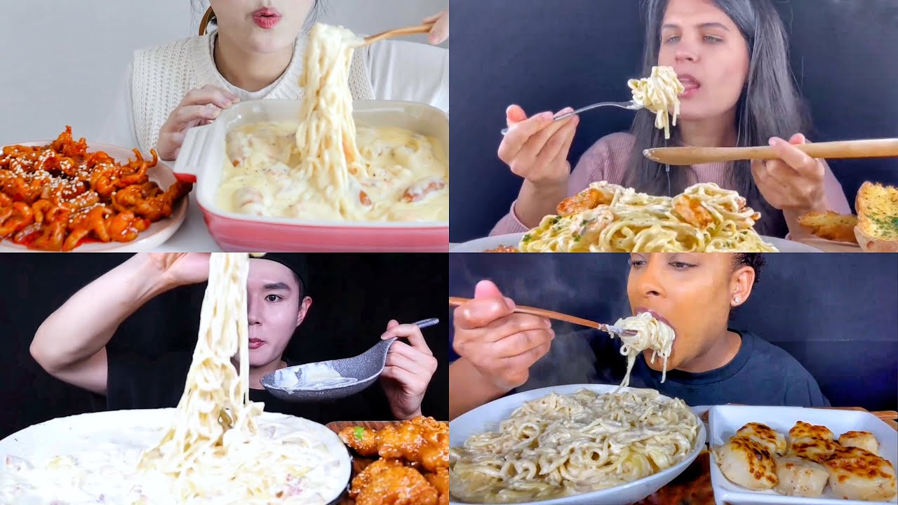 Mukbangers consuming/eating creamy pasta, eating compilation, eating sounds, asmr compilation, asmr mukbang, asmr eating, asmr food