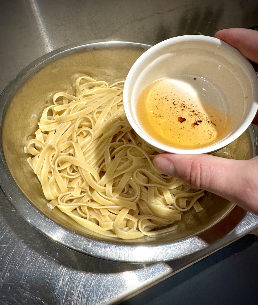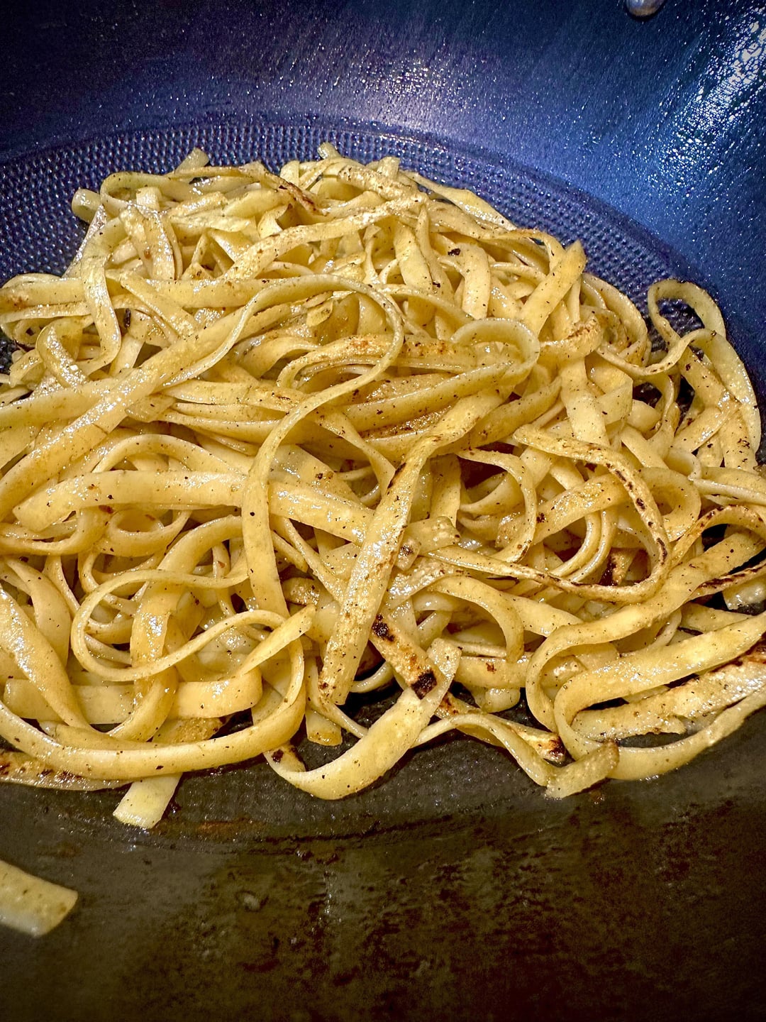 Pasta cooked al dente, tossed in rendered pork fat and charred/smoked over flame – Finishing of in a pan with pasta water and a bit of lemon juice and lastly tossed in a slow simmered tomato sauce with grated spicy salami.