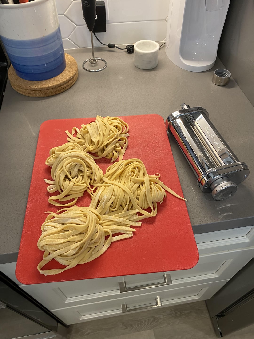 Pasta recipe: used the [Kitchenaid](https://www.kitchenaid.com/pinch-of-help/stand-mixers/how-to-make-homemade-pasta.html) simple pasta recipe. 4 eggs, 3.4 cups of all purpose flour, 1tsp salt. Mix and knead with stand mixer. Let sit for 20-30 min. Rolled to setting 4 and cut with the fettuccine cutter.