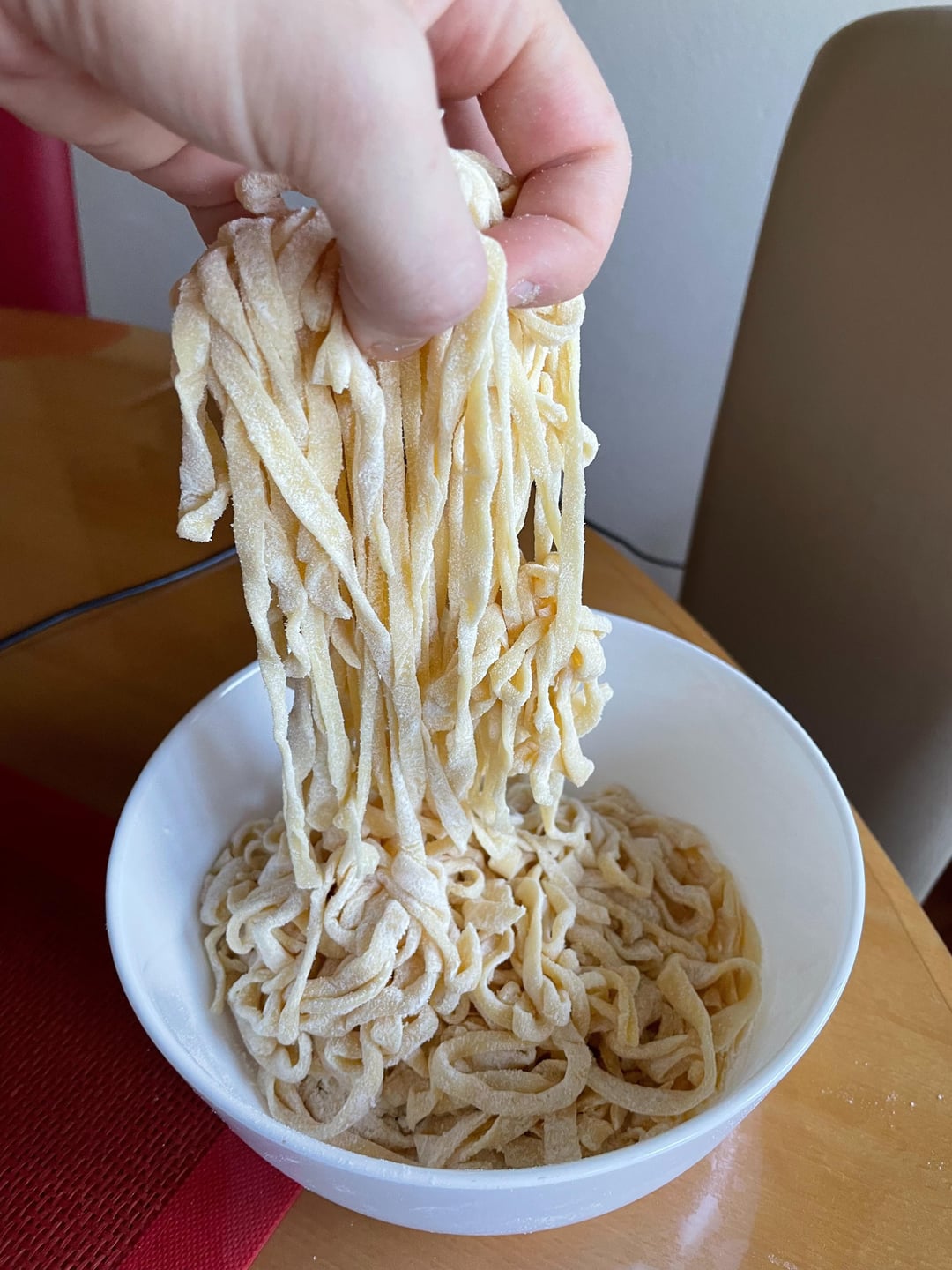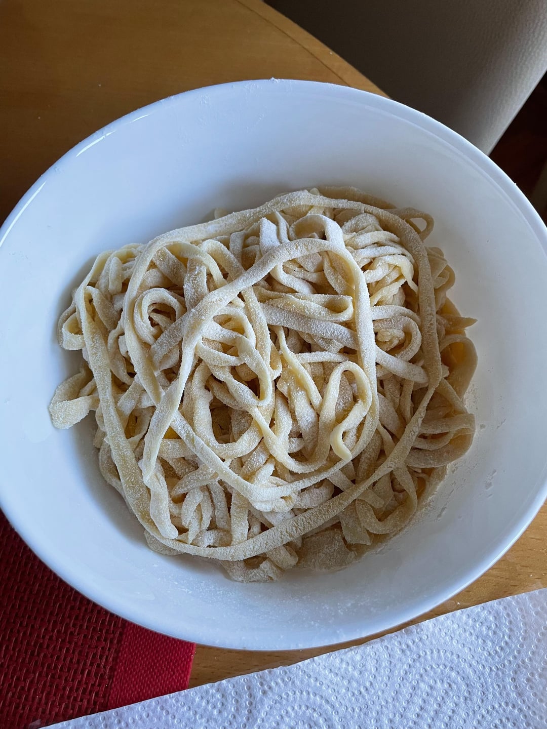 Looks great! Very nice texture to hold sauce. Get yourself a pasta rack or lay it out flat then there will be no need for all the excess flouring. Also, course semolina flour works well to keep it from sticking. It’s larger grain is slower to suck into the pasta and maintains it’s separating quality. It’s also easier to clean up because it doesn’t spread everywhere.
