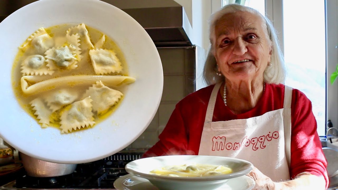 91 year old Enrichetta lives in the mountains behind Genova in Liguria, north west Italy. And she has been busy preparing special ravioli, which are served with dried maccheroni pasta in a meat broth. The filling includes marjoram, borage and offal, but don’t let that put you off. These are aromatic and delicious and a great way to celebrate Christmas.