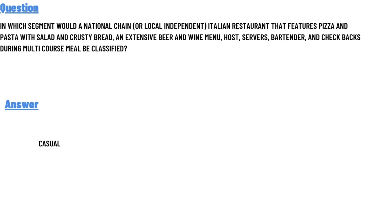 In which segment would a national chain (or local independent) Italian restaurant that features pizza and pasta with salad and crusty bread, an extensive beer and wine menu, host, servers, bartender, and check backs during multi course meal be classified?