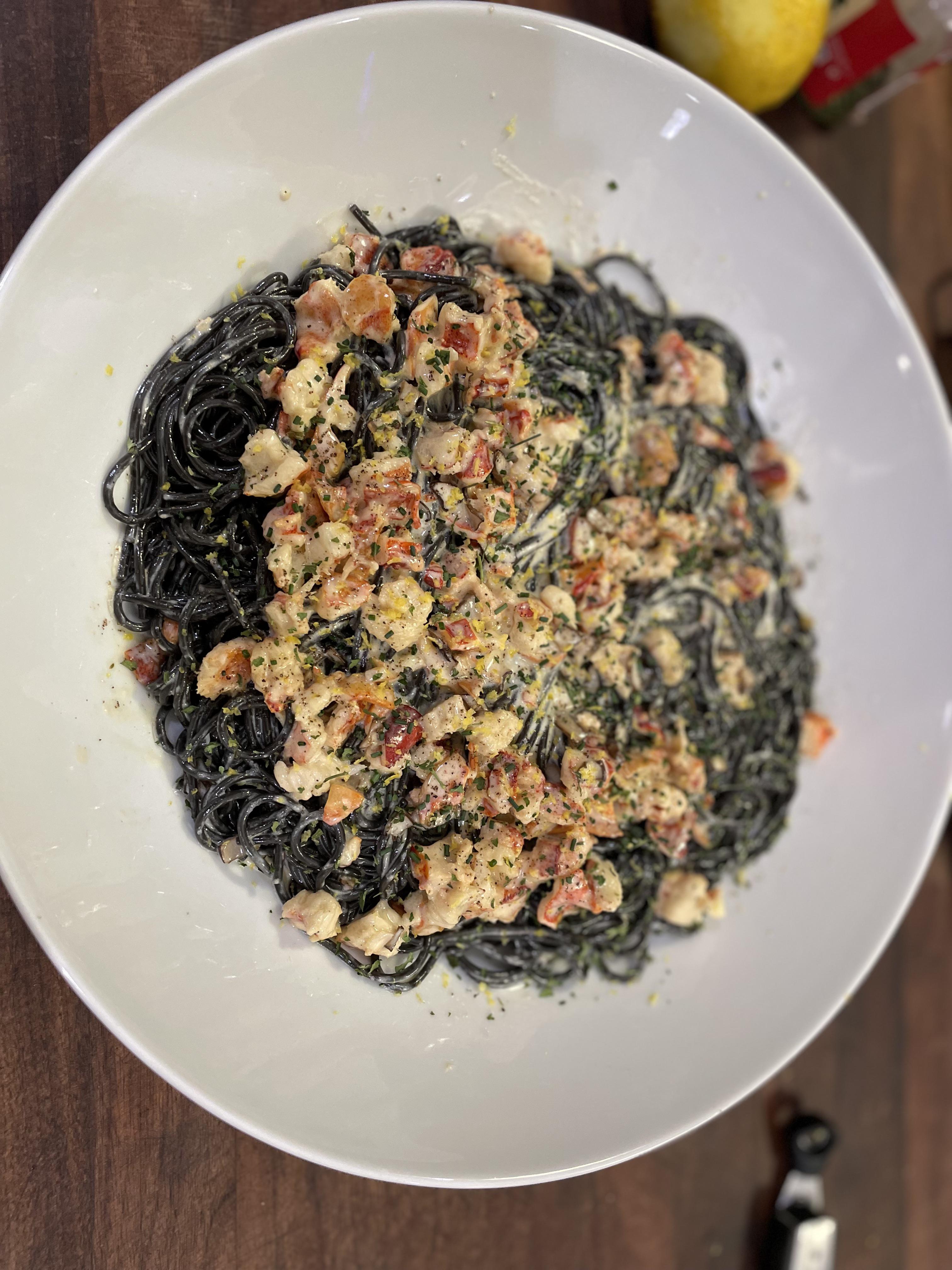 Decided to reduce heavy cream with the herbs, onion, garlic and parm rind instead of the the flour roux and whole milk. Here is the recipe I based it on: https://cookingwithcurls.com/2017/10/13/squid-ink-pasta-lobster-cream-sauce/ For squid ink pasta I use my Nonnas recipe, but it is a lot quicker to just buy some. AKA if I shared it I am going to get haunted by her ghost :).