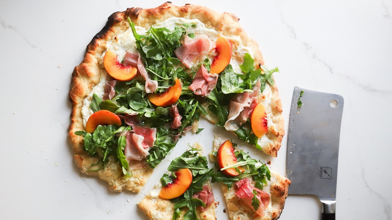 Introducing salad pizza into your weekly dinner rotation can be a great way to enjoy the comforting essence of pizza while still getting a generous serving of fresh vegetables. This sweet-and-savory take on Italian salad pizza combines prosciutto and peppery arugula with sweet sliced nectarines.