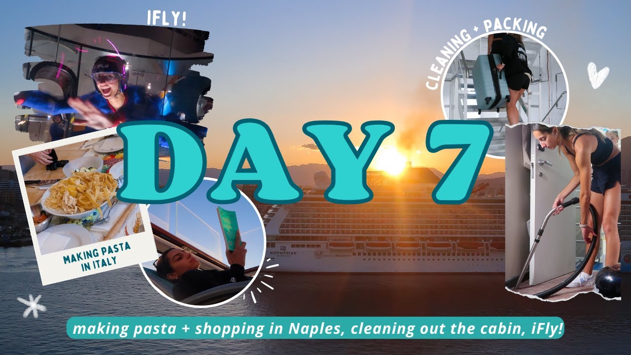 This is a long one, it’s a jam packed last day of the contract! 🙁 We watching the ship port in Naples, Italy at sunrise and take a pasta making class! Jewel & I also take you around while we go shopping in Naples. We also go support Cast 4 do a run of Showgirl! Since it’s the last day, Caitlin and I clean out our entire cabin and bring you along on all our responsibilities we have to take care of before sign off! The cast is finally allowed to do iFly on the sports deck so I bring you along for all the fun! We finish our day at the crew bar saying goodbye to many of our friends on board.