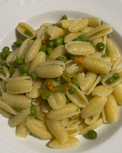 Scusate il ritardo amici, ma oggi sono stata molto impegnata. Ieri ho trovato dei fiori di zucca belli e li ho utilizzati in un primo piatto: gnocchetti sardi con piselli (ho utilizzato quelli surgelati) e fiori. Ho cotto prima i piselli per circa 15 minuti in un fondo di olio e cipolla, poi ho unit