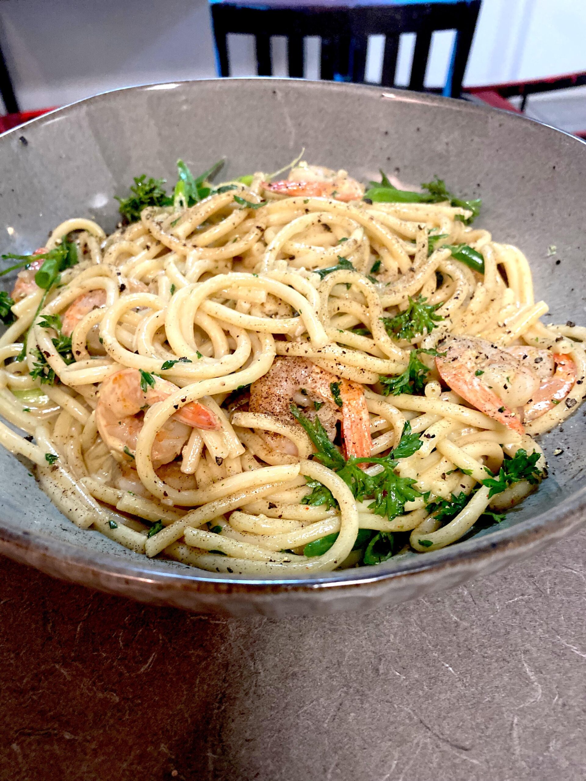 NormalKook 2 years ago One pan in order of cooking: Olive oil & butter Garlic Prawns Cooked pasta More butter Parsley