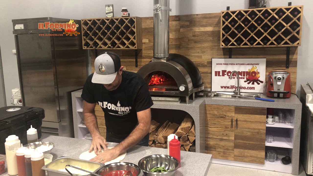 Start by stretching the dough. There are several ways to stretch the dough use the technique that you are more comfortable with. Add the tomato sauce. Do not per-cook the tomato sauce. It is best to use San Marzano Tomatoes. Continue by adding the cheese. We used a mix of Mozzarella cheese and Romano cheese. Cook the pizza in your ilFornino Wood Fired Oven. In this video we are using the ilFornino Elite Chef’s Edition. This is a great oven with a Neapolitan Dome. It cooks fast and has a true Neapolitan style look and feel.