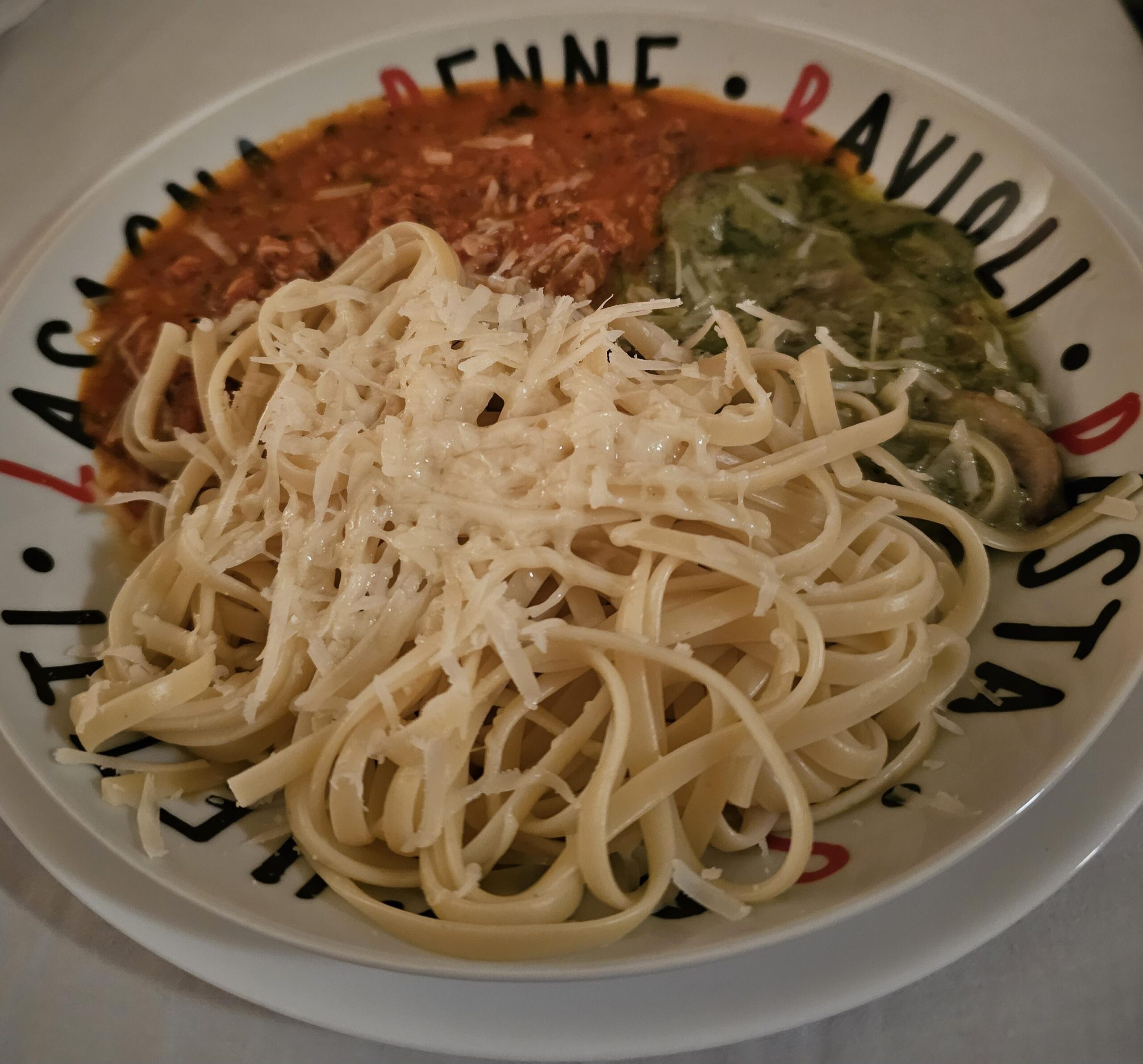 Sauce on left is a pink sauce with broken turkey meatballs. Sauce on right is a spicy basil pesto cream sauce with mushroomszzz. Linguine garnished with a melting parmesan. Fookin BLISS BRAHHHH!!!!