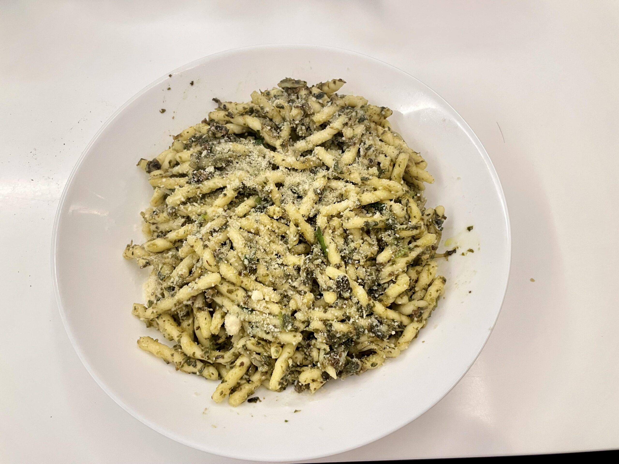 This is kind of a abomination dish for a quick lunch, first time I’ve ever tried trofie, it pairs well with my homemade pesto sauce, which is a mixture of Thai Basil, Garlic, Cashew Nuts and Olive Oil marinated for a few days ( I live in Asia and just have fresh Thai basil in my fridge), the whitebaits are fresh from the market, I just saute it in olive oil for a short time and combine with the pesto to add savouriness and fishy flavour to the dish, kind of like what a canned anchovies would do. Finally I topped it with some Parmigiano, overall the dish turns out to be pretty tasty !