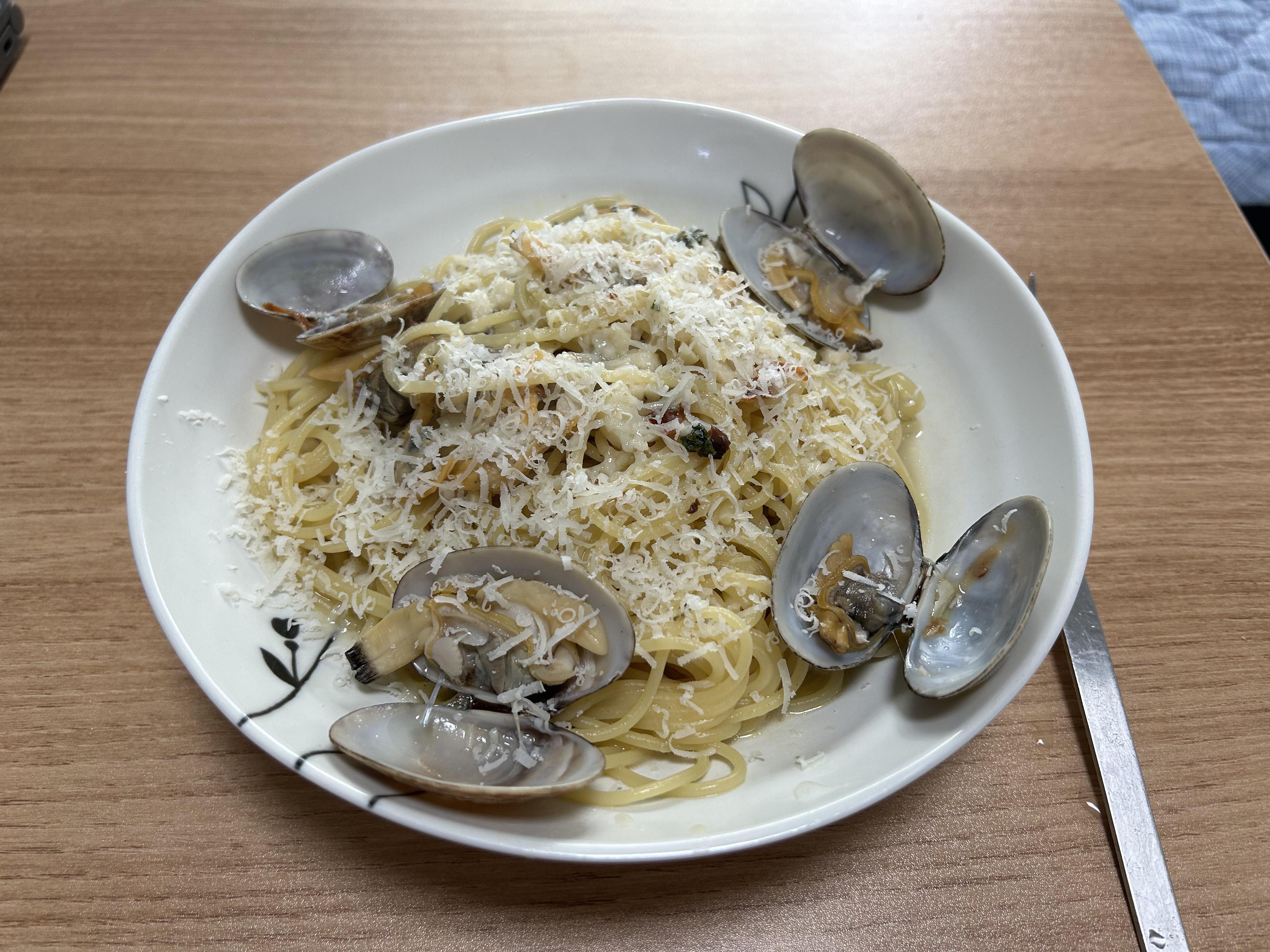 Recipe: I first crushed two pieces of garlic and peperoncino and sauteed it in olive oil. After that I put in clams, a cup of white wine, and cooked the clams for about five minutes. I boiled the pasta in salt water, and cooked the pasta in the clam juice with the clams. Added some parsley and grana padano for the finish.