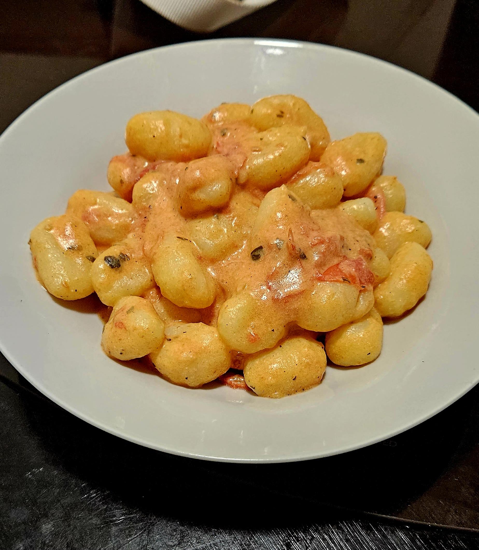 gdc1994 2 years ago Recipe1. Potato gnocchi 2. Fresh tomatoes 3. Extra virgin olive oil 4. Salt 5. Pepper 6. Garlic 7. Ricotta cheese 8. Basil