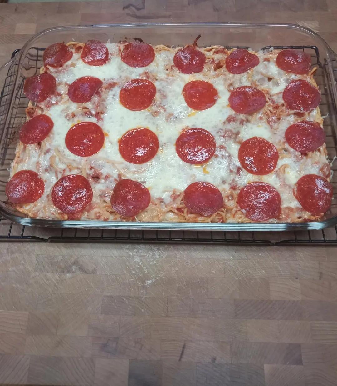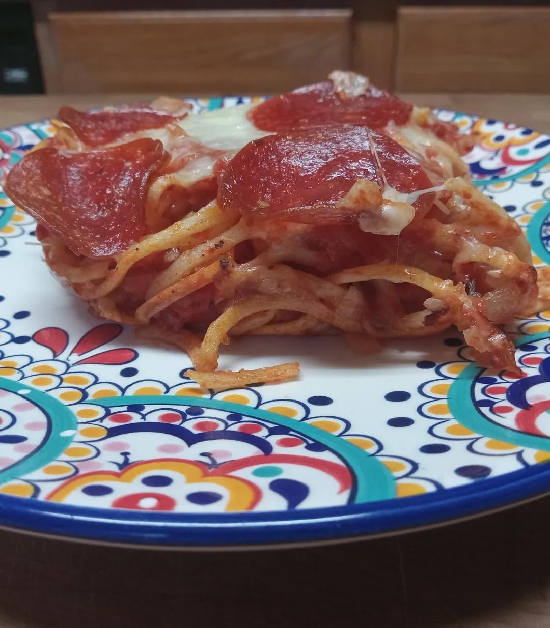 Sfoglia_dreams 2 years ago When I was a pasta cook at Fazolis, one of my favorite dishes to make and eat there was the pizza baked spaghetti. This is my version of that dish. Spaghetti alla chitarra, tomato sauce, mozzarella, and pepperoni.