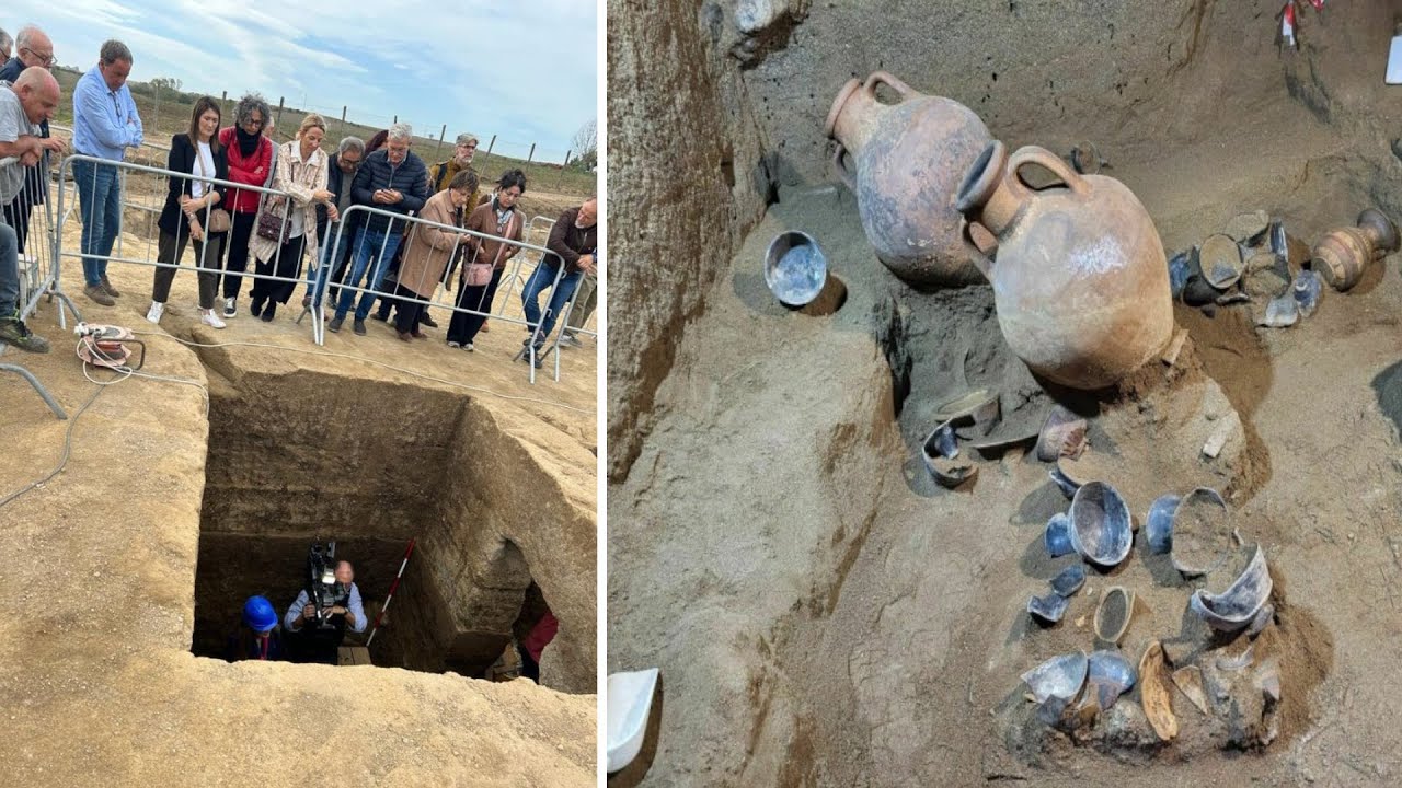 The tomb is approximately 2,600 years old and contains a rich collection of pottery, amphorae, utensils, cups, and a bronze cauldron. The objects are all in excellent condition, including a tablecloth that was used in the Etruscan religious ritual of the “last meal,” a food offering burned inside the tomb before it was sealed.