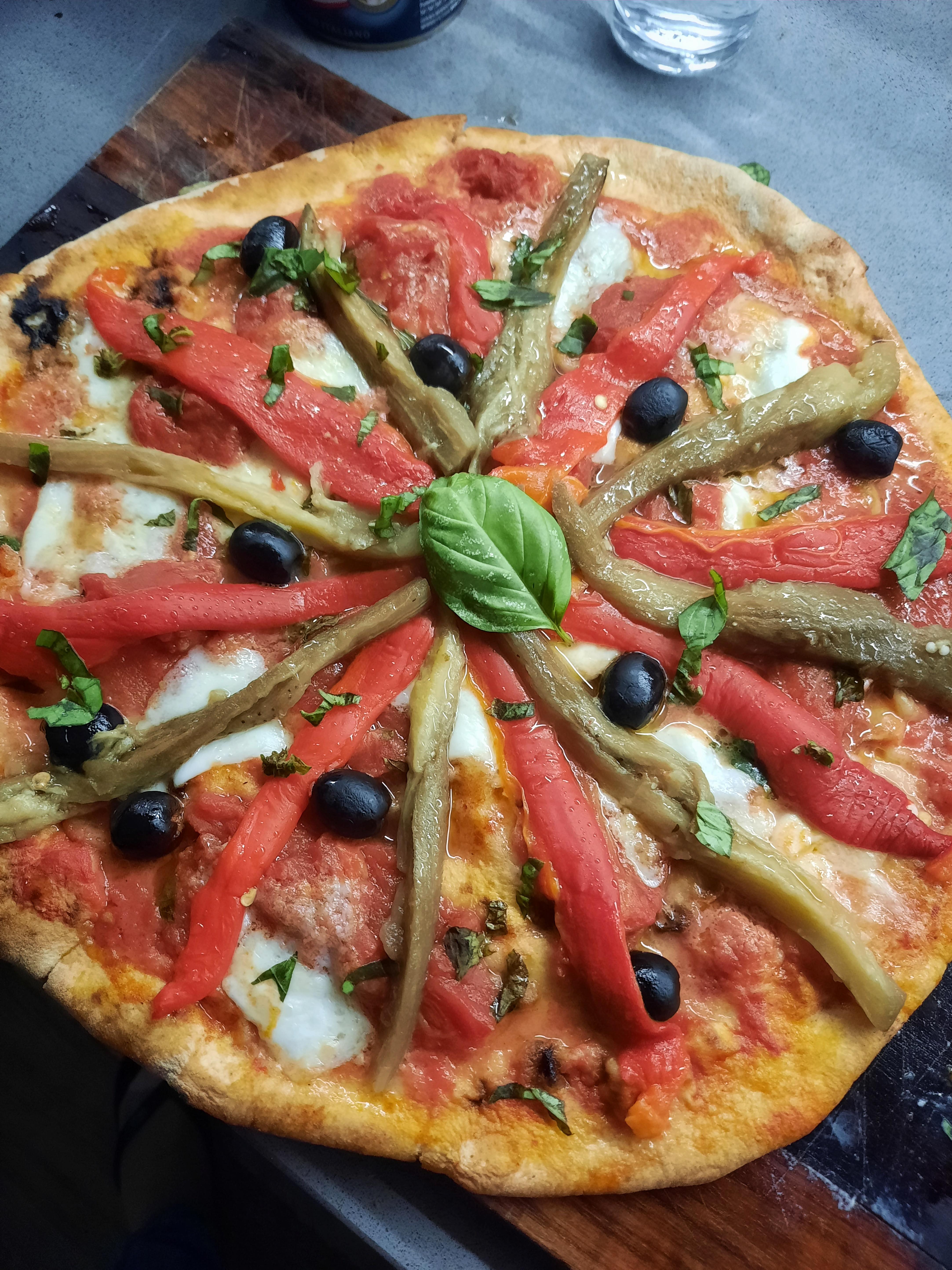 Pelati and mozzarella di búfala on there, plus escalivada (roasted and peeled eggplant and red pepper set in good olive oil). The olives are “round-trip”: produced here in Spain, sent to Italy, and then imported back here (this seemed to be the case with most olives at the Italian shop).