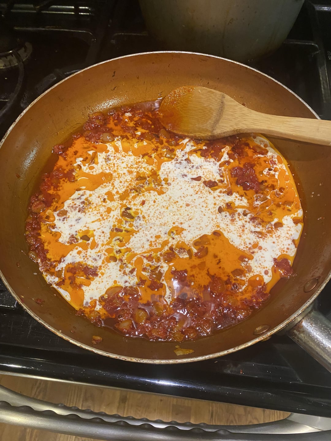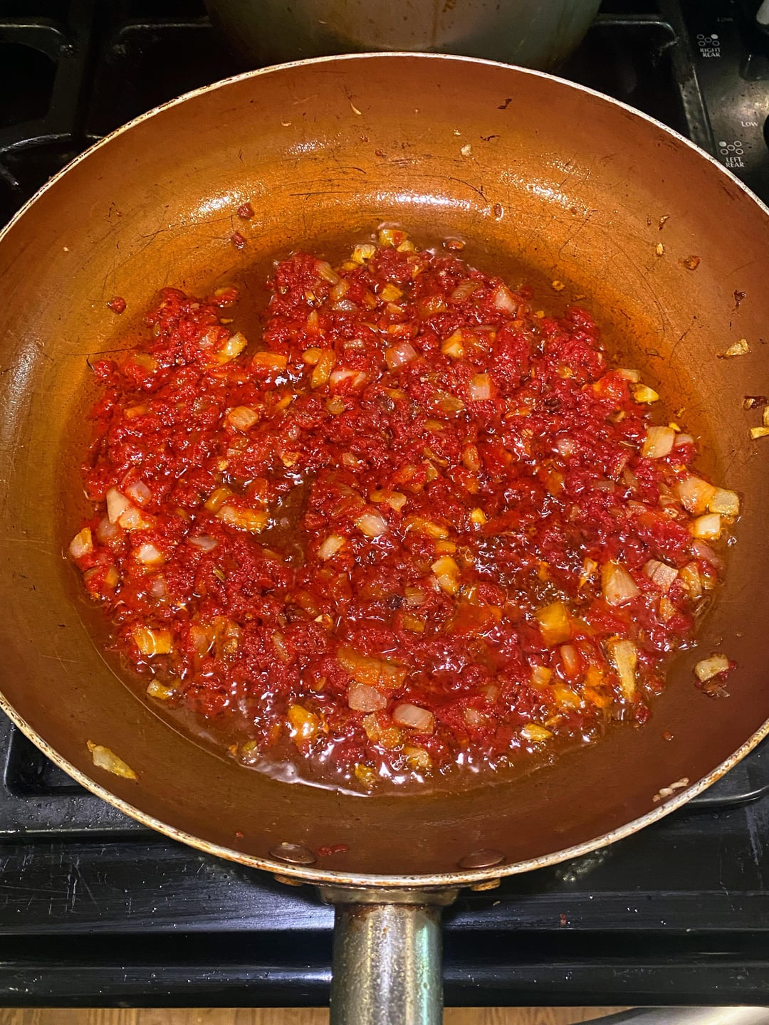 Finely dice onion and smash garlic into paste or slice as thin as possible. Start a large pot of salted water on stove. Heat some olive oil medium low heat in sautรฉ pan and add onion. Cook down til onion softens and then add garlic. Cook a few more minutes until garlic is fragrant. Add entire tube of tomato concentrate to pan and stir til everything is coated. Cook down tomato paste for 2-5 minutes until it has a nice deep red color like 2nd photo. Turn heat to medium and add vodka and deglaze the pan and scrape any bits stuck to pan. Cook 3 minutes or until alcohol is fully burned off. By now the water should be boiling. Drop pasta in water and stir. Add cream to measuring cup and add a quarter cup of boiling water to cream to heat it up a bit so it doesnโt break when adding to hot pan. Slowly add the cream to the pan while continuously stirring til all cream is mixed in and let simmer on low stirring occasionally. Take another quarter cup to half cup of pasta water and add to pan and slowly mix in cheese. Use as much as you want, sometimes I go crazy with it. Stir vigorously till itโs all incorporated and sauce is shiny and thickened. Pull pasta 1 minute before directed cooking time and add to sauce to finish. You can use any type of pasta you want. The prosciutto is optional. You can fry it in a pan before started or I cook mine in my air fryer. It cooks really quick.