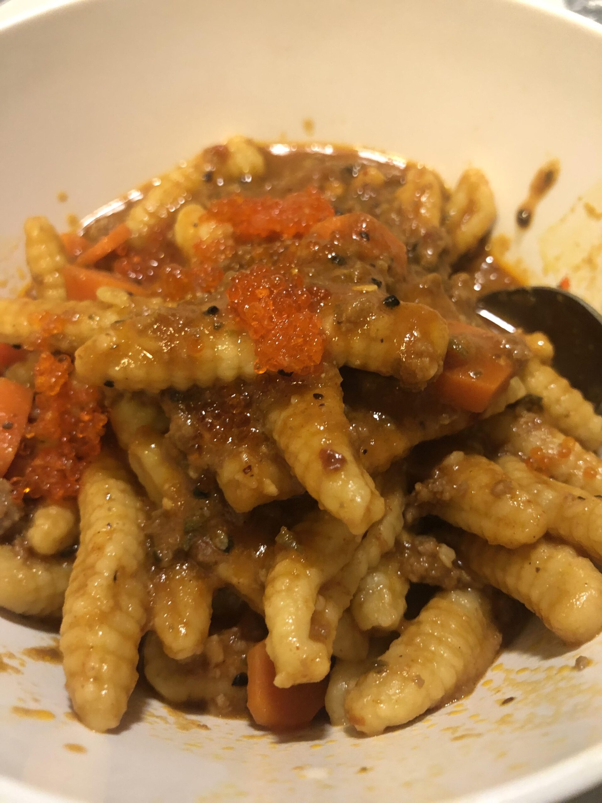 Cook down -carrot -red pepper flake -garden tomatoes -black garlic -gochujang paste -waterToss fresh cavatelli in sauce Garnish with TobikoEnjoy ☺️by aquateen5 Homemade Dish - From ScratchPasta 4 Comments retoy1 2 years ago This looks delicious and your pasta looks incredible.I must admit though that the shape of the pasta somewhat resembles large maggots and I’m having a difficult time seeing beyond that. Is it just me? aquateen5 2 years ago Lol the most delicious maggot like food ever. You aren’t wrong though 😂. Also thank you for your kind words! jackoirl 2 years ago Not often I have to google and ingredient!Orange tobiko is flying fish roe! Present-Ad-9441 2 years ago The combination of gochujang and tobiko confuses me but I trust you. And now I’m curiousWrite A CommentYou must be logged in to post a comment.