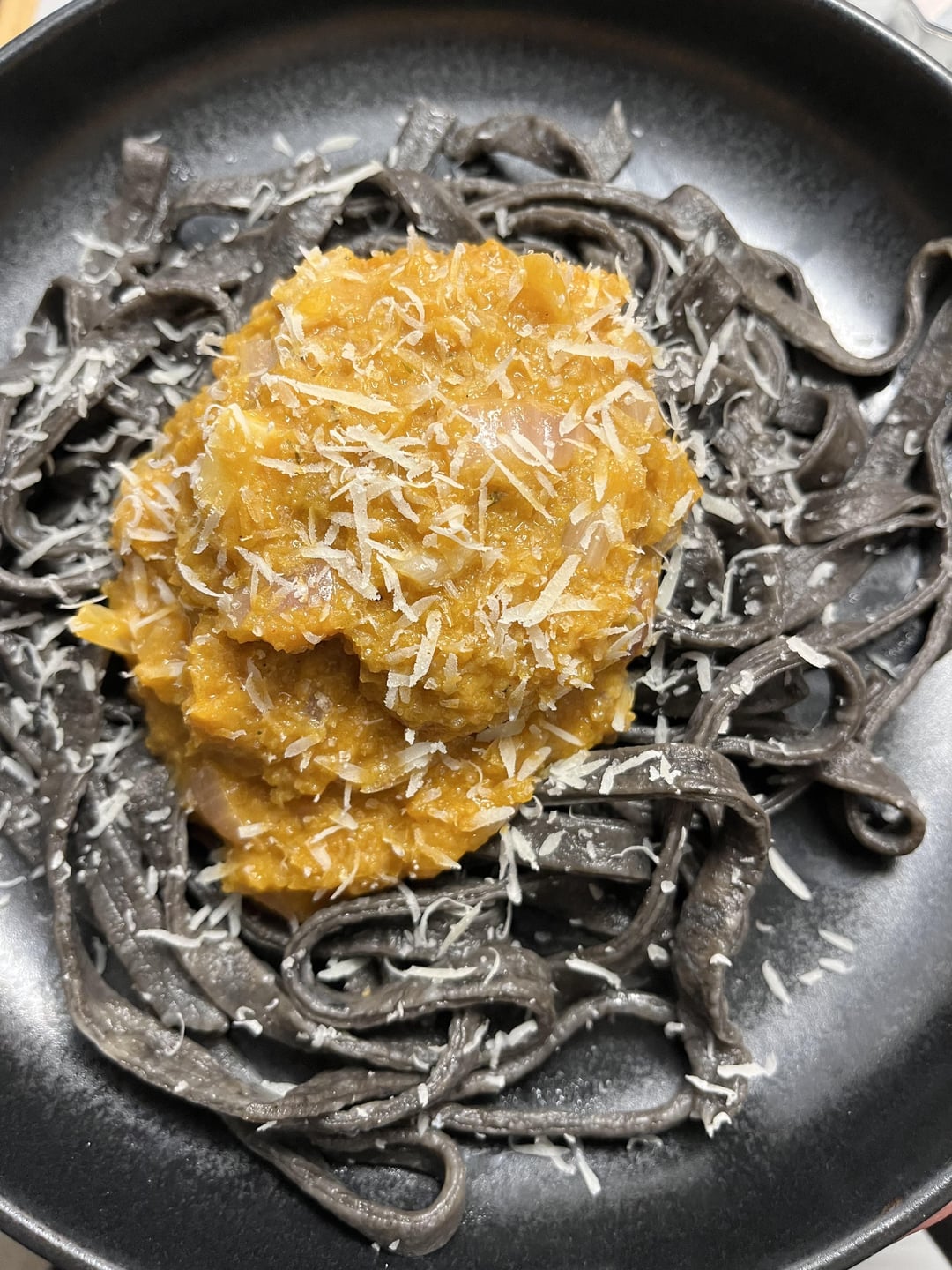 Plate the tagliatelle, add a couple of heaping dollops of sauce on top, season with pecorino!