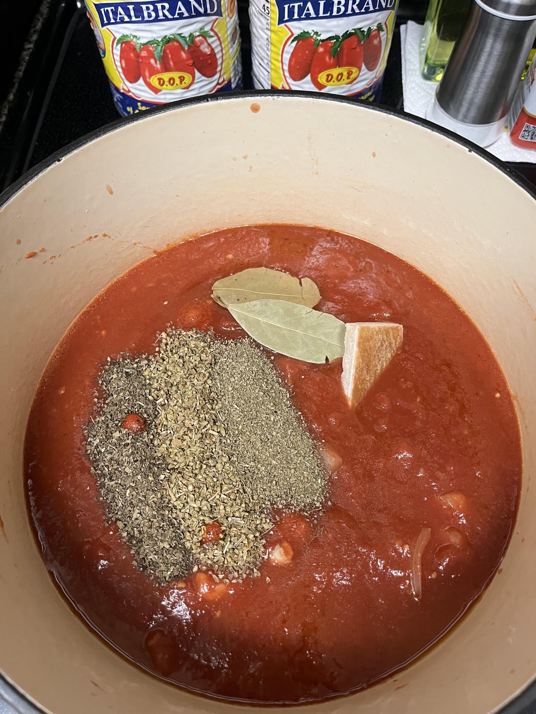 Marinara Sauce: White onion, garlic, salt, San Marzano tomatoes, basil, oregano, sage, bay leaves, parmigiano rind.