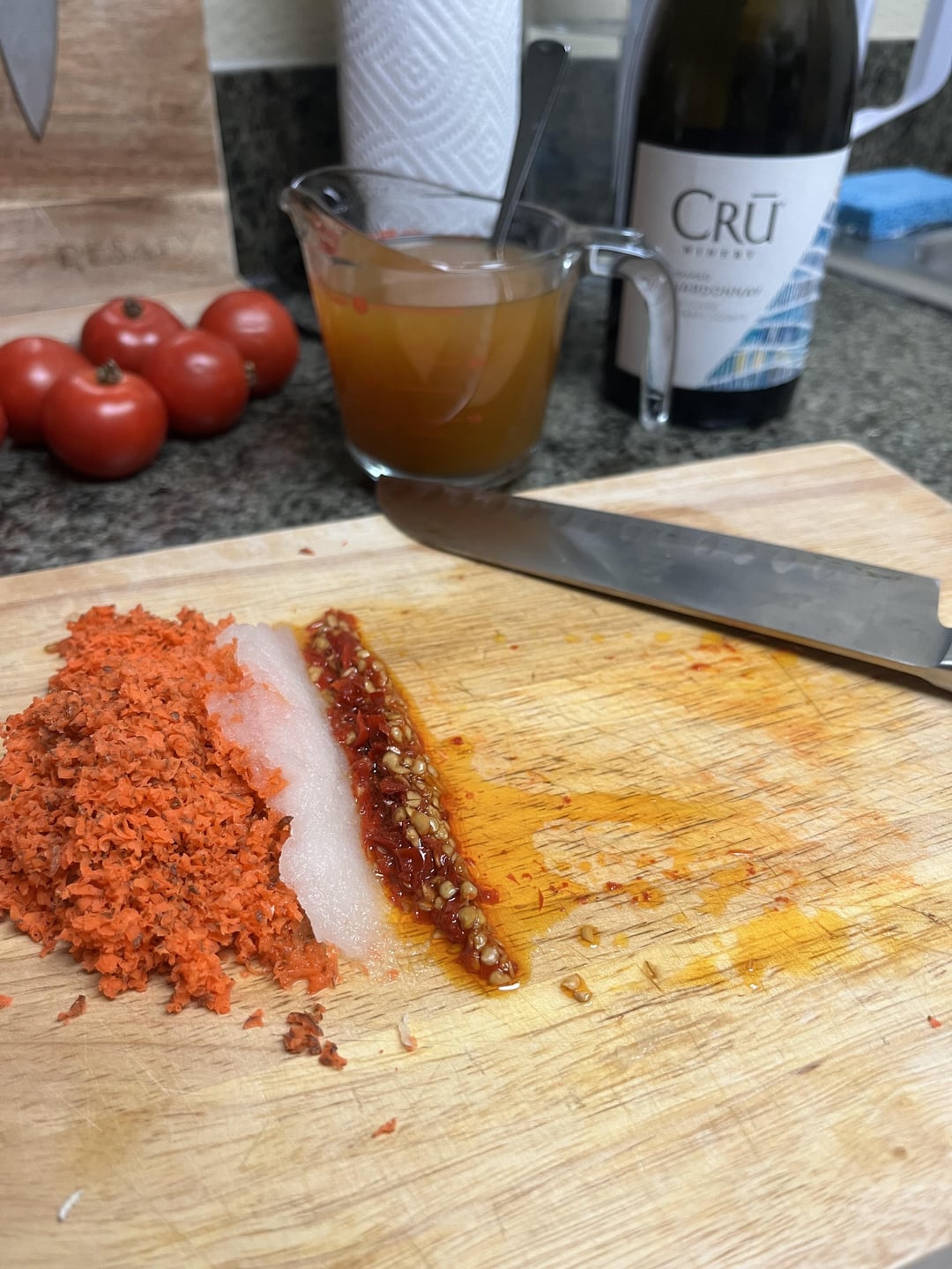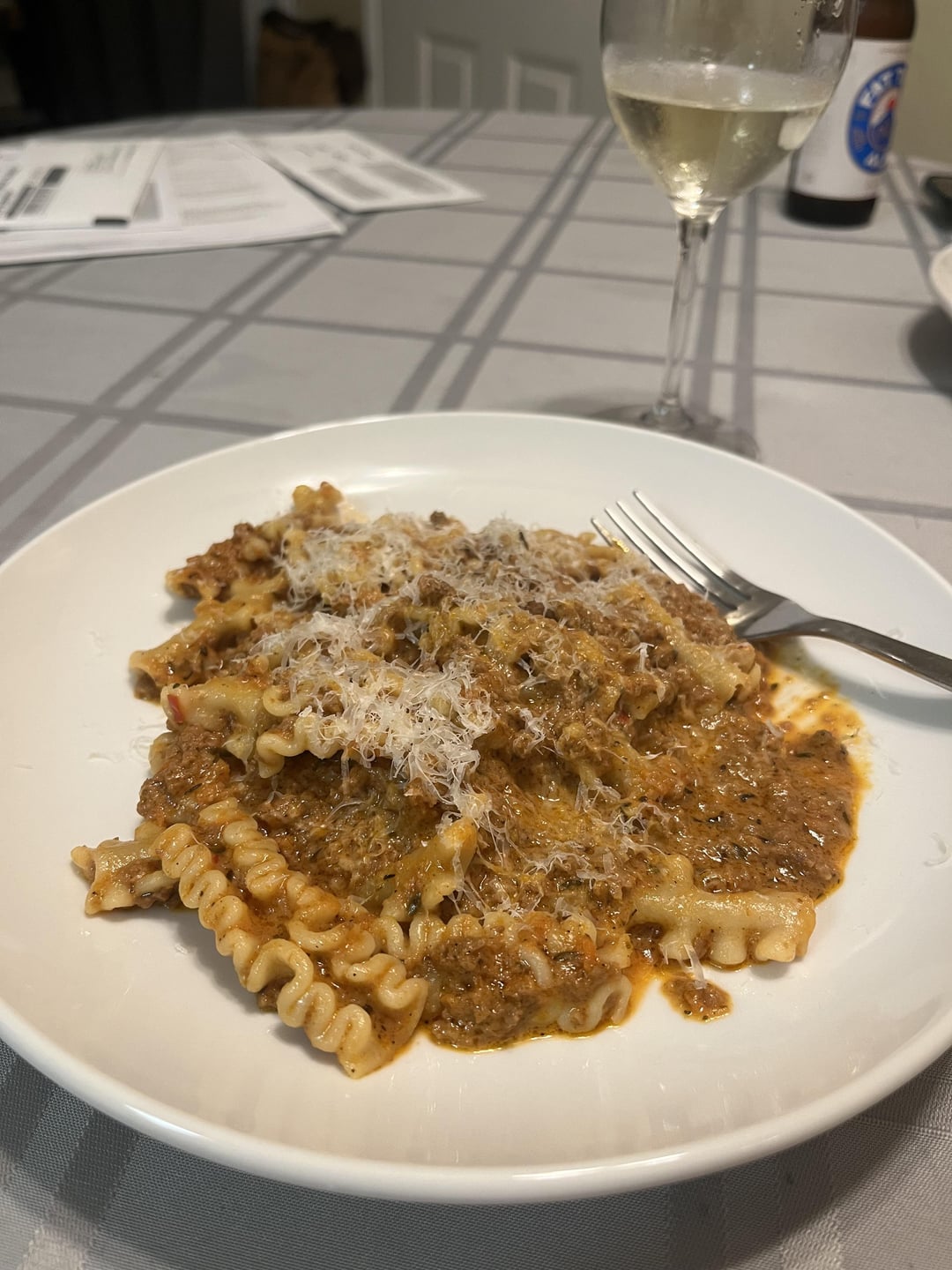 Bolognese: impossible beef (usually also savory pork sausage), salt, grated carrot/onion, Calabrian chiles, thyme, brown butter, white wine mixed with veg stock concentrate, marinara sauce, aged balsamic, cream.