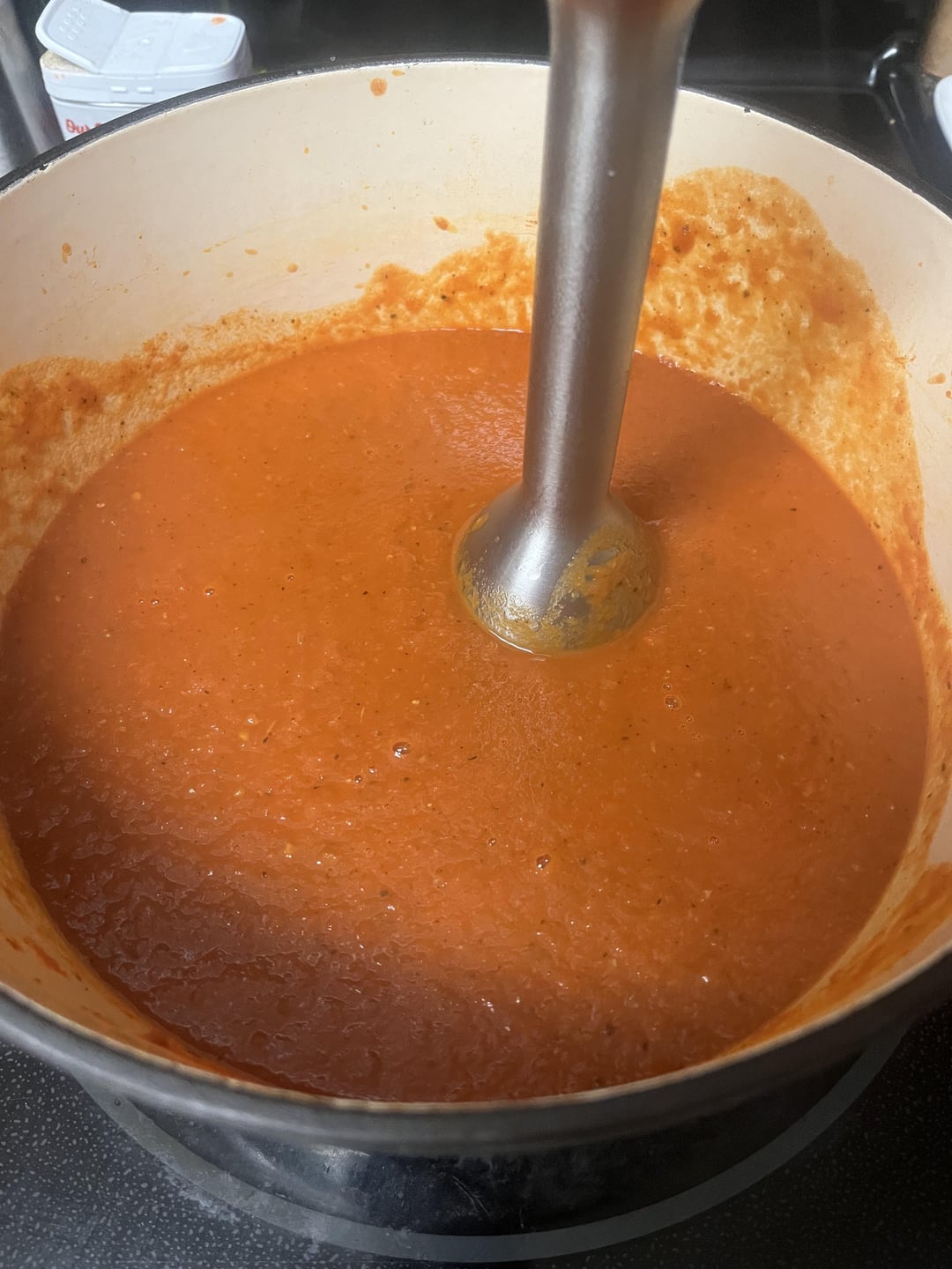 Soften onions and garlic in olive oil on medium temp, crush tomatoes into pot, add seasonings, bring to gentle simmer and cover, temp low. 2 hours occasional stirring. Pull out bay leaves and parm rind, blend.